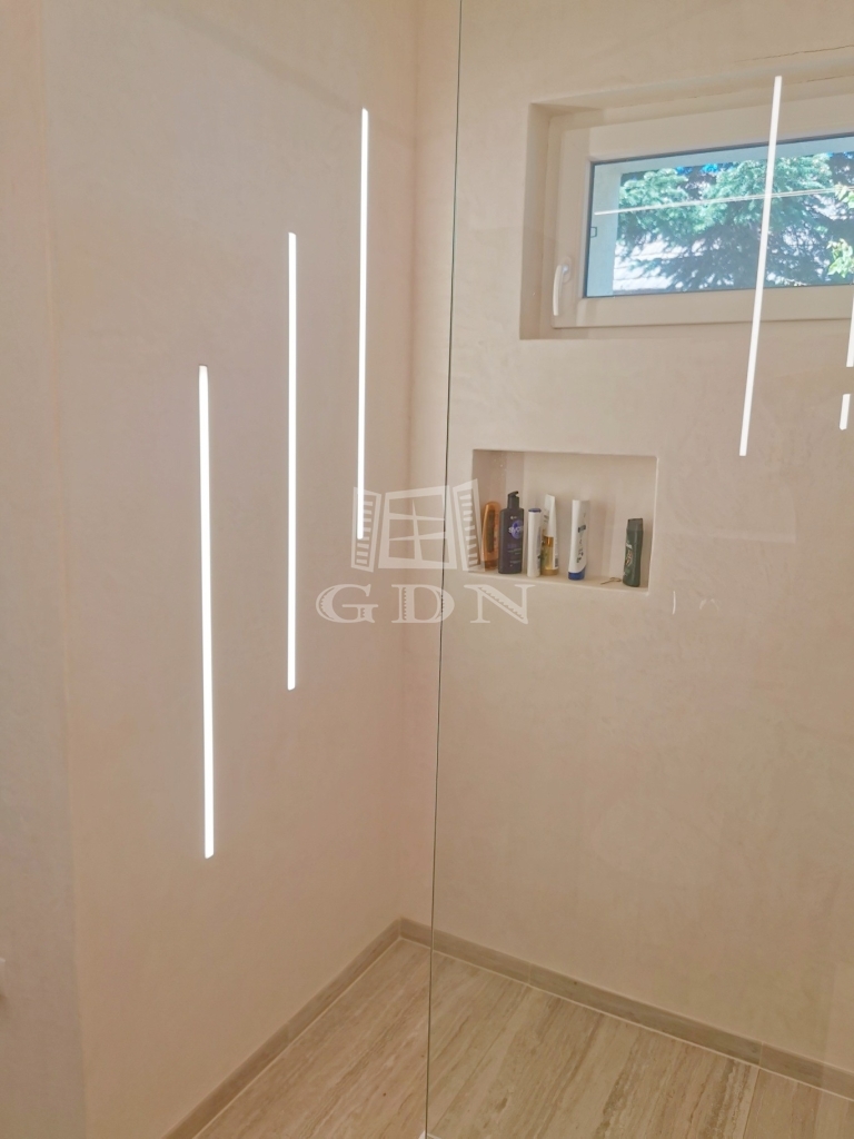 A fedett, fűthető és hűthető medence (7 x 3,5 m) egész évben használható. Ehhez kapcsolódik egy kültéri zuhany, valamint egy fedett grillrész pizza kemencével – tökéletes helyszín baráti összejövetelekhez vagy csendes pihenéshez. A kert kialakítása átgondolt: automata öntözőrendszer kúttal, gondozott zöldfelületek, kerti tó és robotfűnyíró biztosítják a kényelmet és az esztétikus megjelenést.