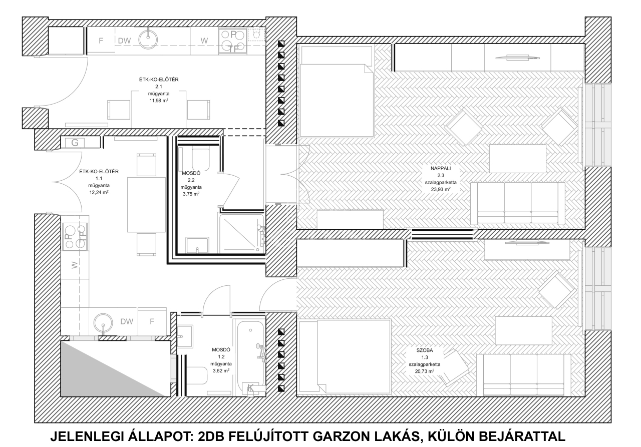 Igény esetén a két lakás könnyen egybe is nyitható, így egy 3 szobás, tágas lakást kapunk. Átalakításnál múszaki rész kiépített, nem igényel plusz munkát.