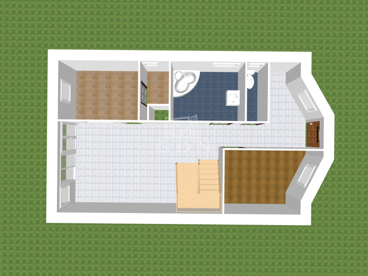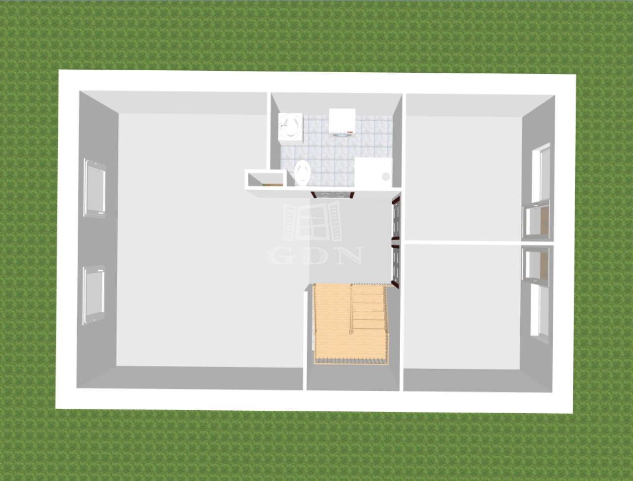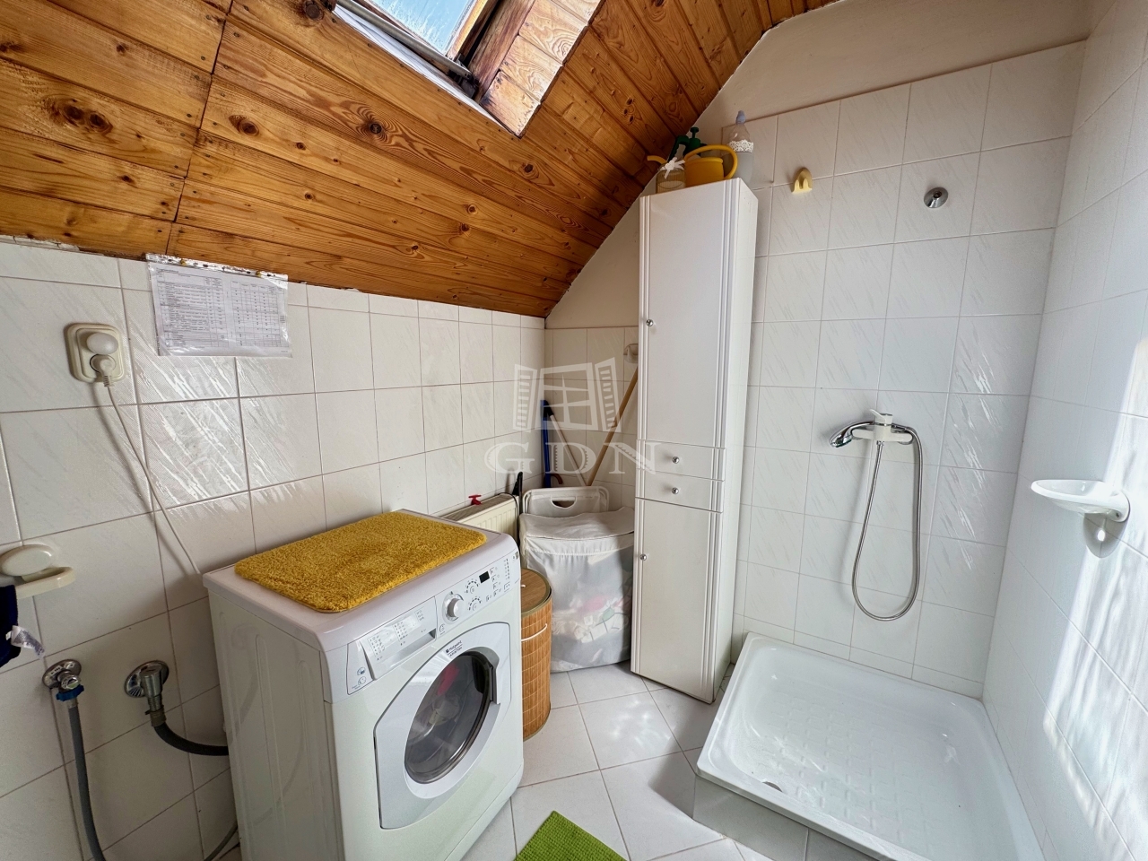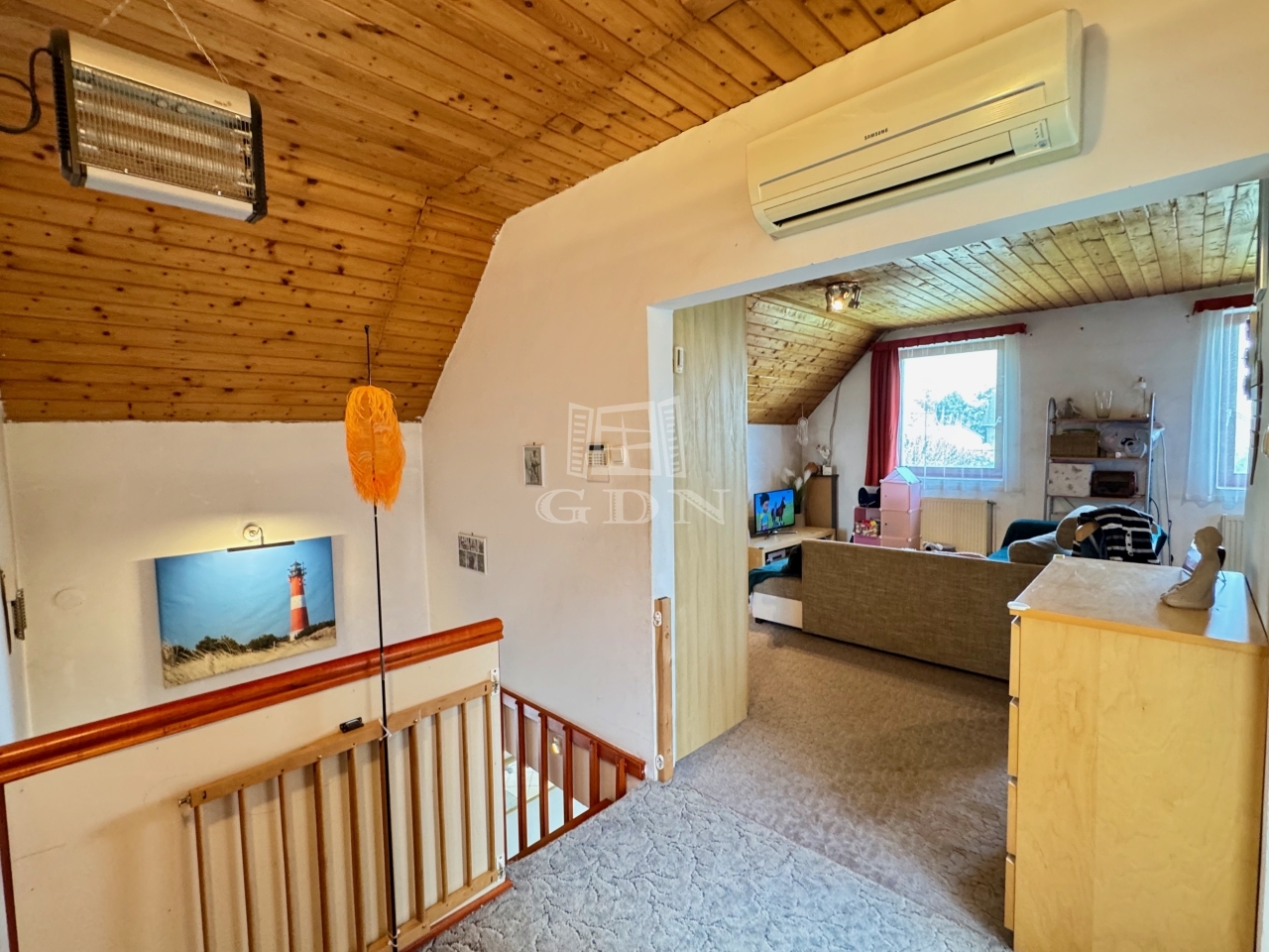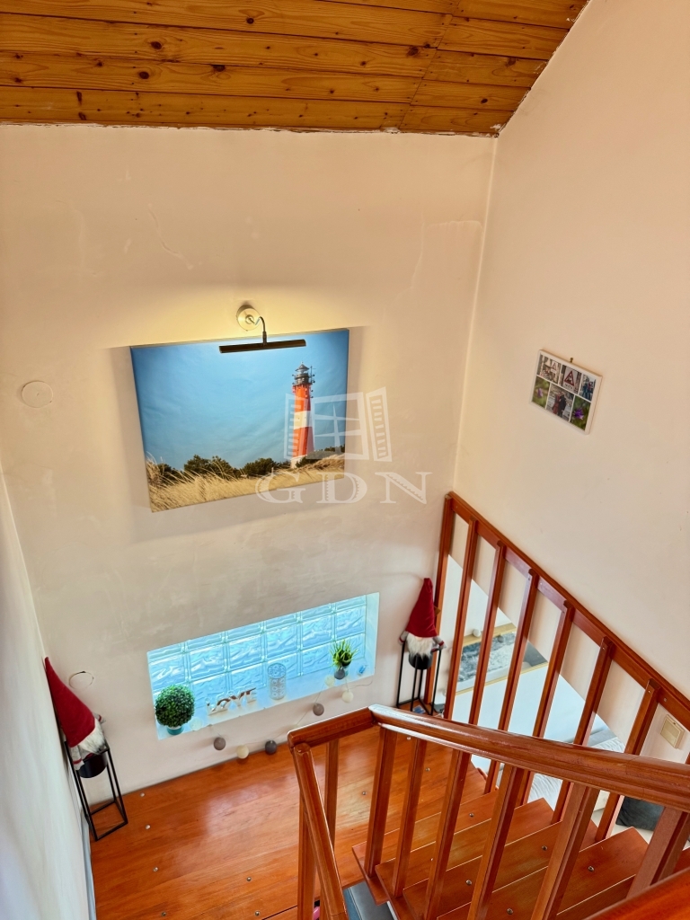 A földszinten, melynek hasznos alapterülete 74m2, előszoba (9m2), nappali (22,5m2), vele egy légtérben konyha (7,5m2), ezen kívül egy kamra (2m2), egy szoba (8m2), egy fürdőszoba (7m2), külön WC (2m2), illetve a bejáratnál 8m2, nappaliból pedig 13,5m2 terasz található.