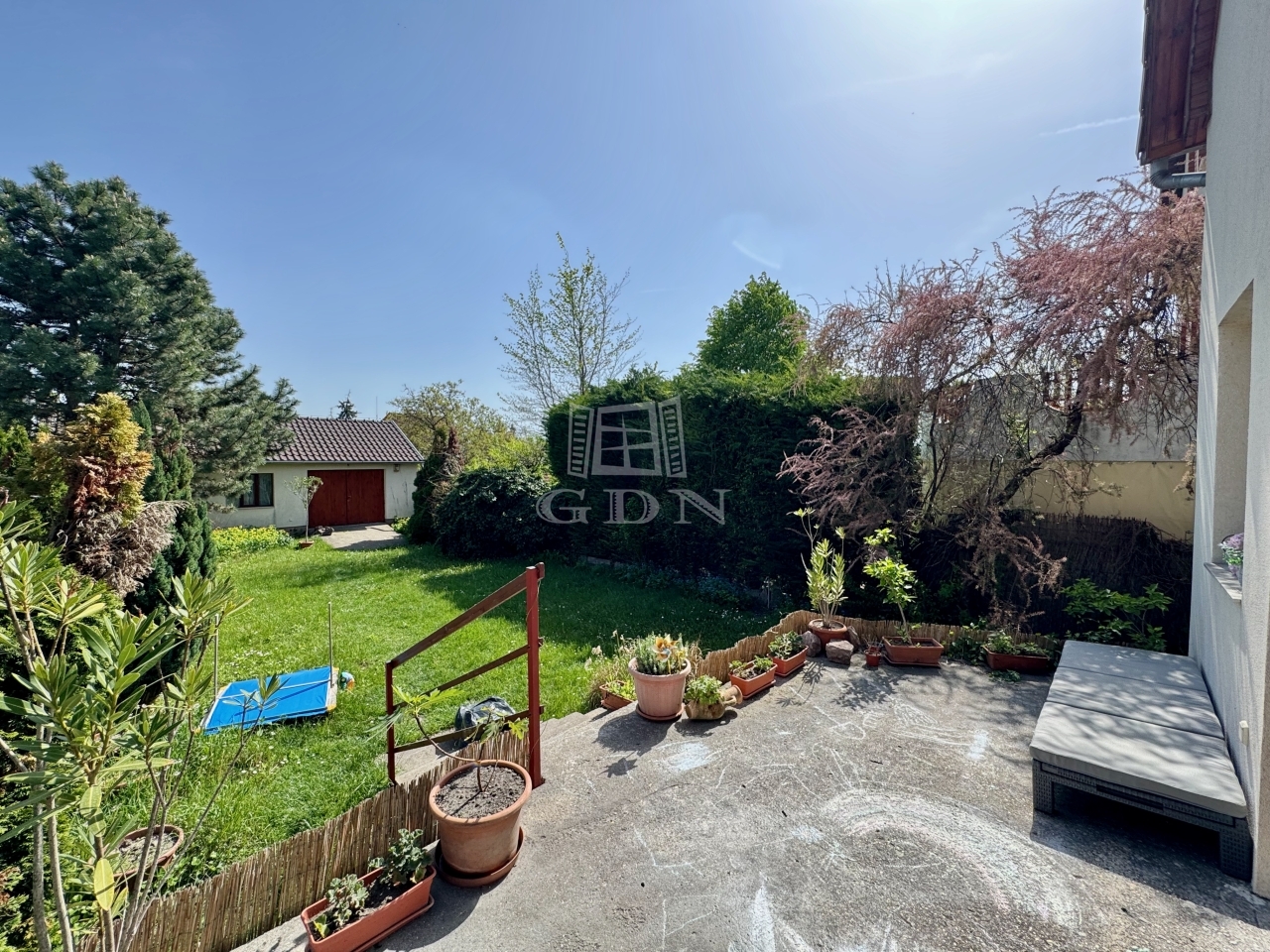 A kert végében egy 43m2-es hőszigetelt (7 cm kőzetgyapottal), közművesített (csatorna kivételével) téglaépület található, hűtő-fűtő klímával felszerelt, mely jelenleg tároló/garázs és iroda funkciót lát el, de igény szerint egy külön lakás is kialakítható benne.