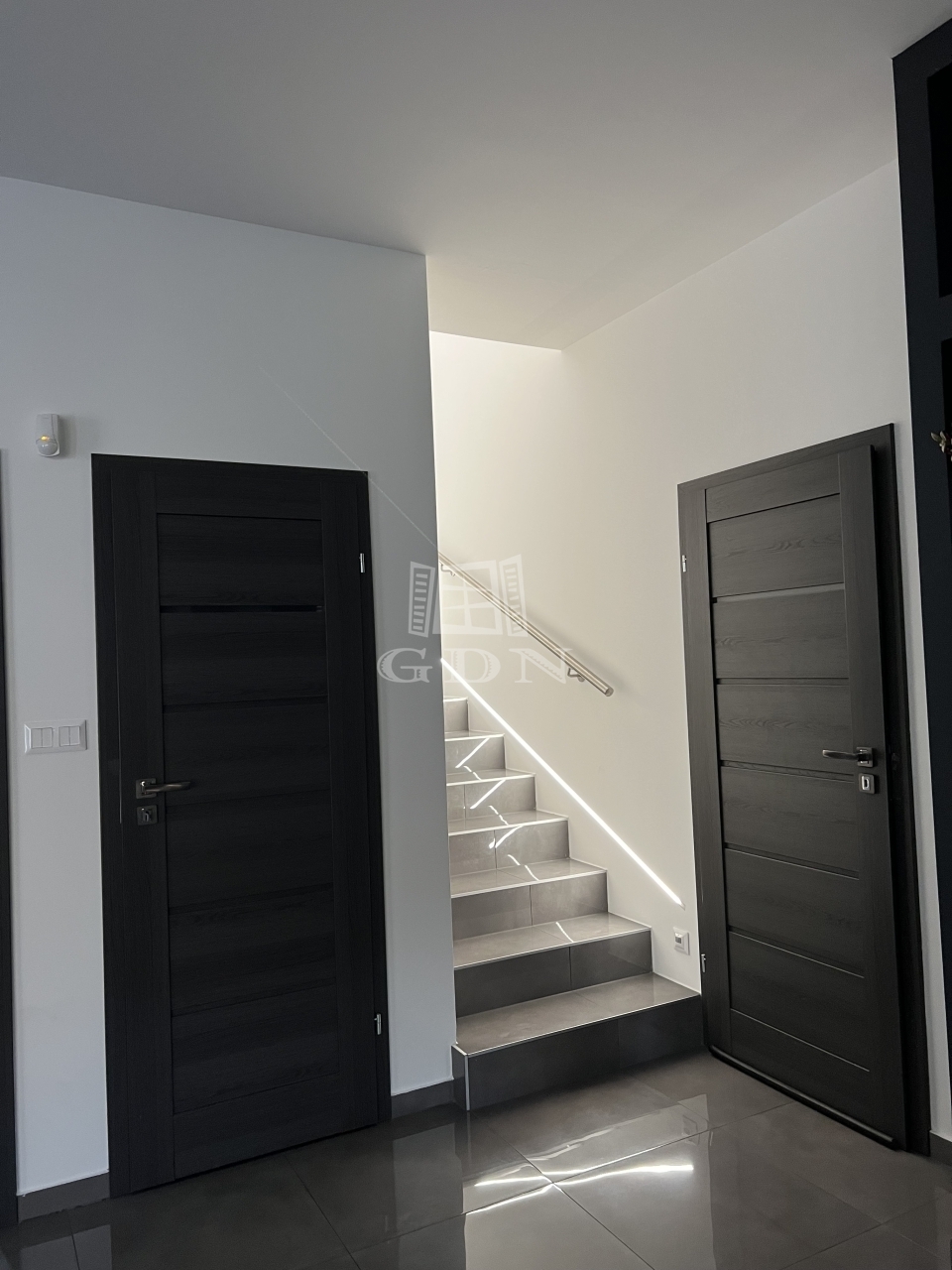 Az épület elrendezése átgondolt és élhető, a földszinten csak a garázsnál érintkezik a szomszéddal, az emeleten pedig mindössze két hálószobánál van a kapcsolódási pont.