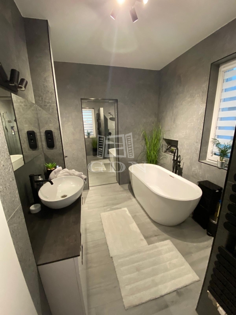 Az alaprajzhoz képest az emeleten a szülői hálószobából egy elegáns tükör tolóajtón keresztül közvetlenül is megközelíthető a fenti fürdőszoba, amely szintén prémium érzetet ad ennek a helyiségnek is.