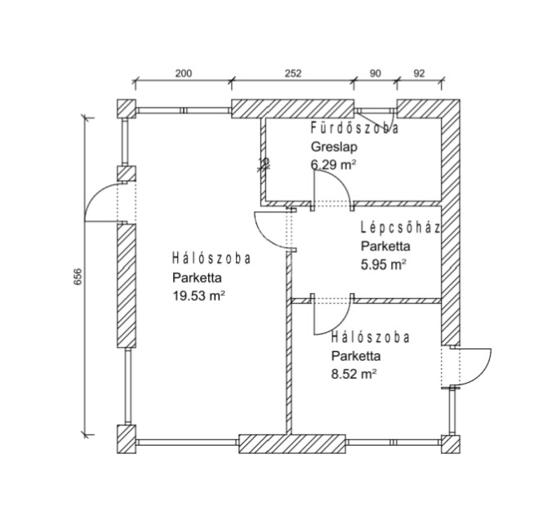 Emelet (41 m² + 9 m² erkély): 2 szoba, fürdőszoba (3 szoba könnyen kialakítható)
