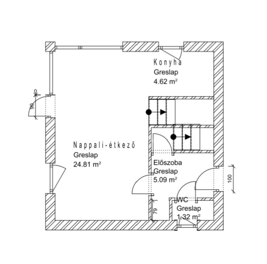Földszint (41,5 m² + 8 m² terasz): nappali, külön WC
