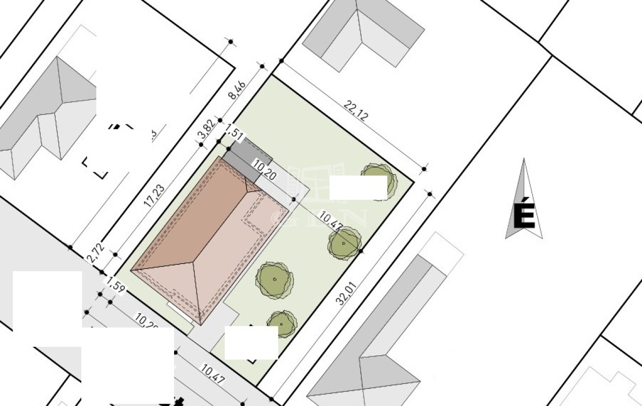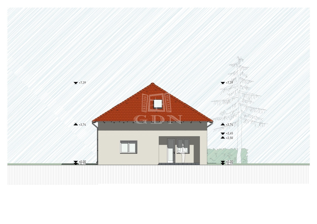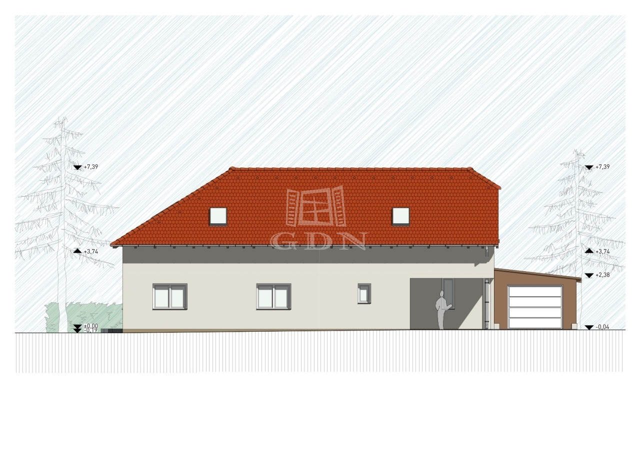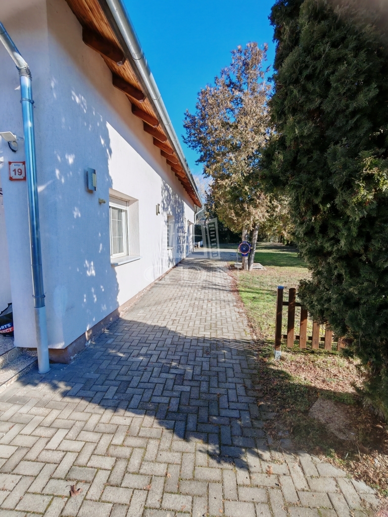 A ház egy 713 m²-es, rendezett, sík telken helyezkedik el, garázzsal és kb. 10 m²-es földes pincével.