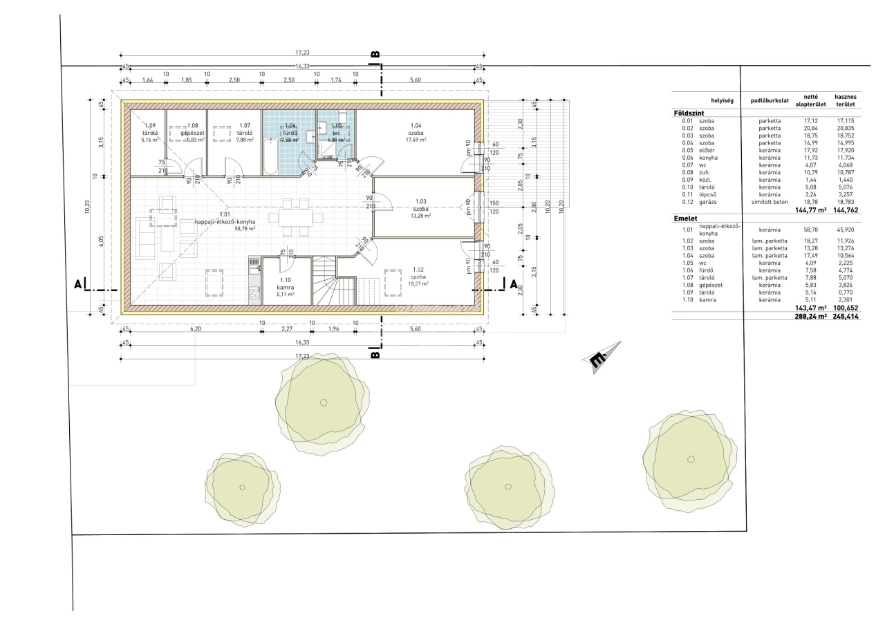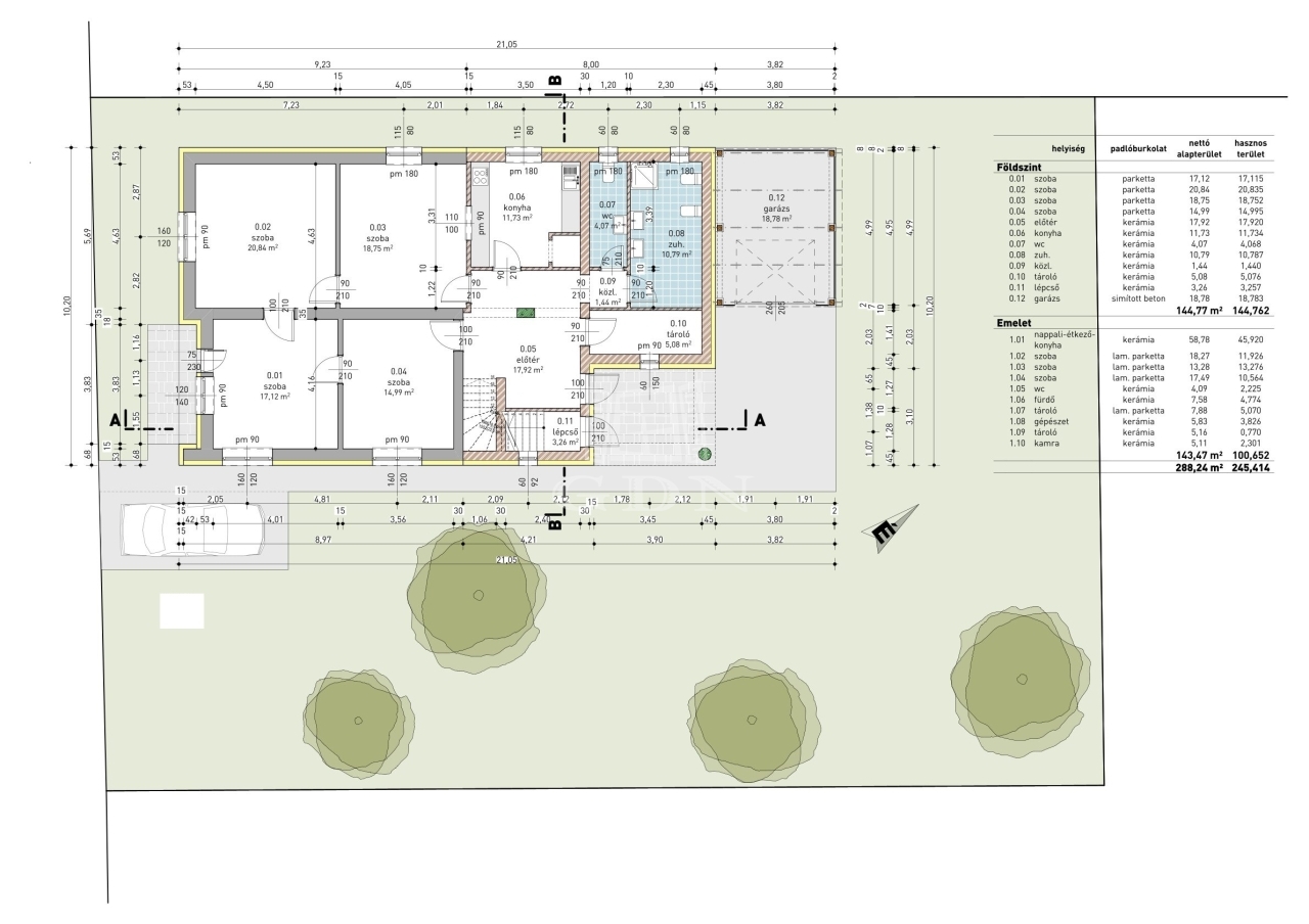 A két ingatlan úgy oszlik meg, hogy a földszinten van 144 nm hasznos lakótér és az emeleten pedig 101 nm.