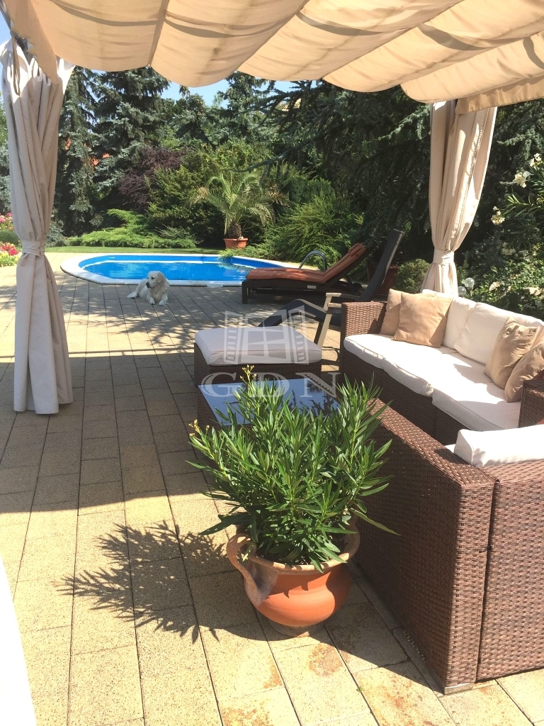 A kert parkosított, automata öntözőrendszerrel ellátott, medencével kiegészített. Az évek során kialakított, gondosan válogatott növényállomány értéke szinte felbecsülhetetlen, igazi, intim kertvárosi hangulatot biztosít.