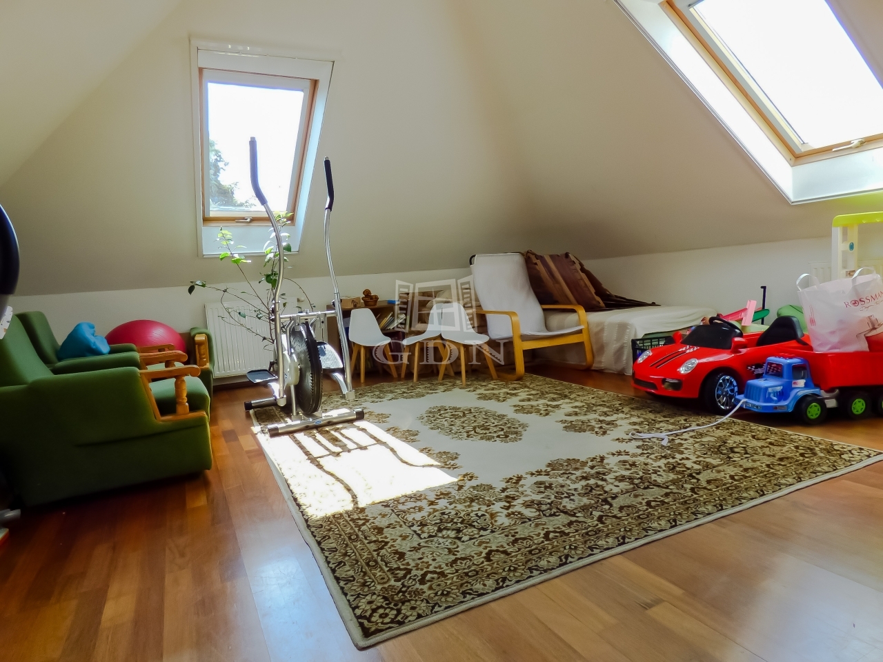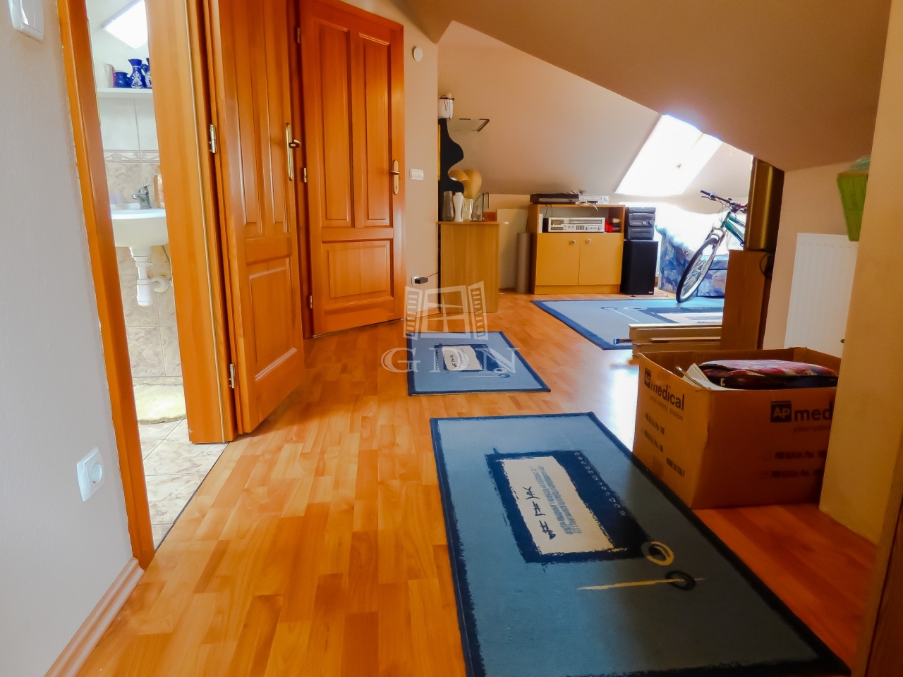 Az emelet nagy nappali, hálószoba, konyha (amely jelenleg gardrobeként funkcionál), fürdőszoba kialakítású.