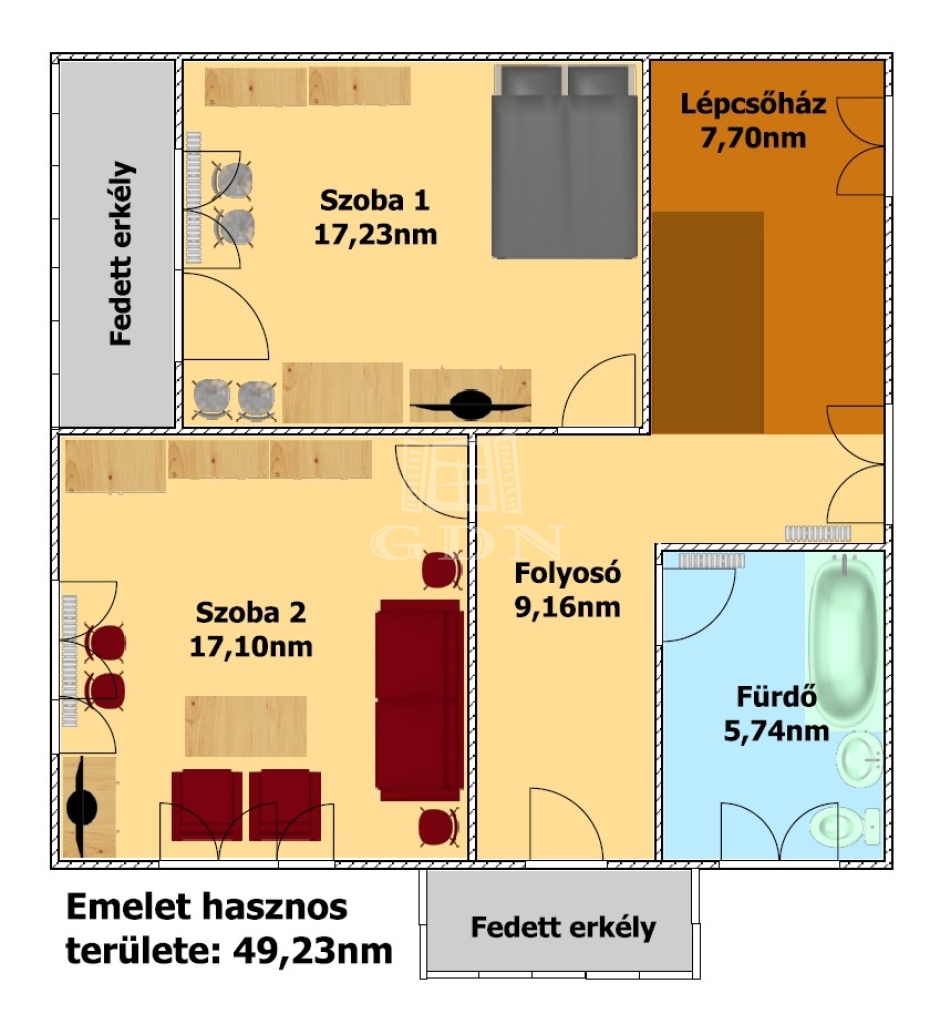 A lakóépület mind két bejáratánál valamint a hozzá épített nyári konyha és a tárolók előtt fedett teraszok találhatót. Továbbá az emeleten a nagy szoba valamint a folyosó előtt is erkély lett kialakítva. Az épület akár 3 generáció vagy 3 különálló lakrész kialakítására is alkalmas lehet, hiszen a földszint, az emelet, illetve a főépülethez épített nyári konyha a hozzá tartozó tárolókkal átalakíthatók külön lakótérré.