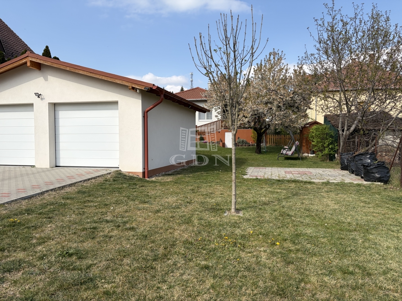 A 900 nm-es telken a kertbe érve, egy 2 beálllásáos garázsba lehet parkolni, melyet 4 éve építettek. A garázskapu elektromos, a garázs tégla szerkezetű.