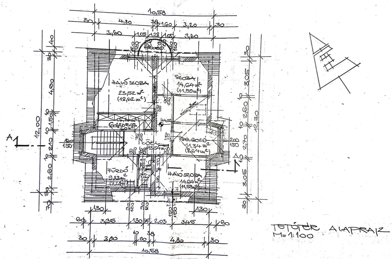 A nettó hasznos lakóterület ( magasföldszint + tetőtér ) 185,81 m² , bruttó lakóterülete pedig 203,63 m².