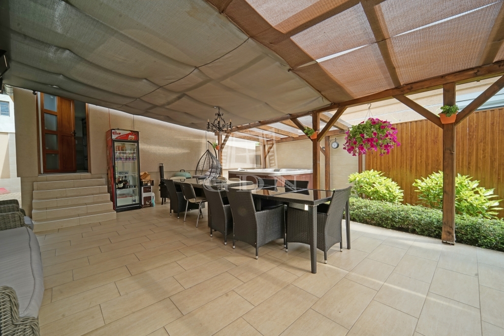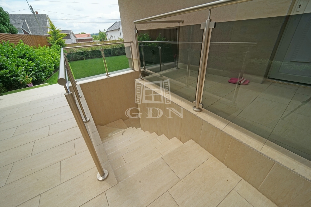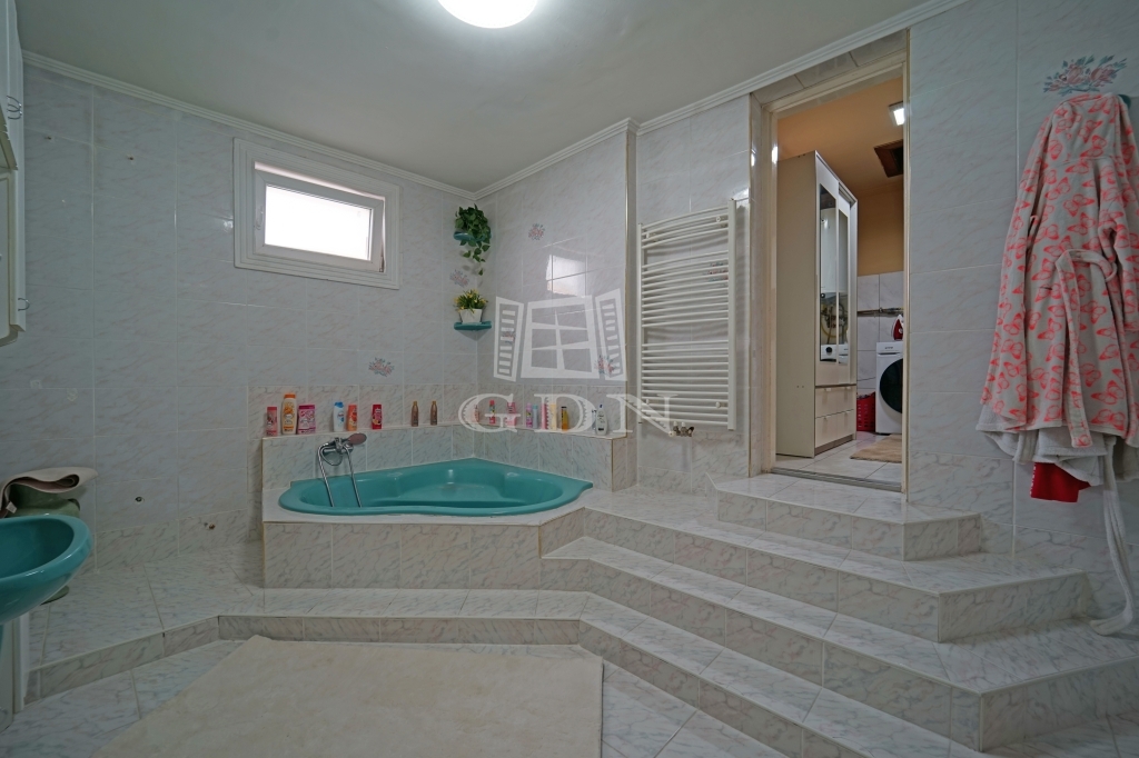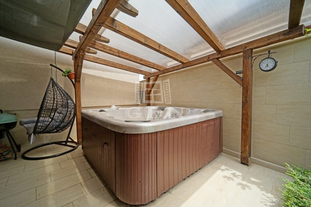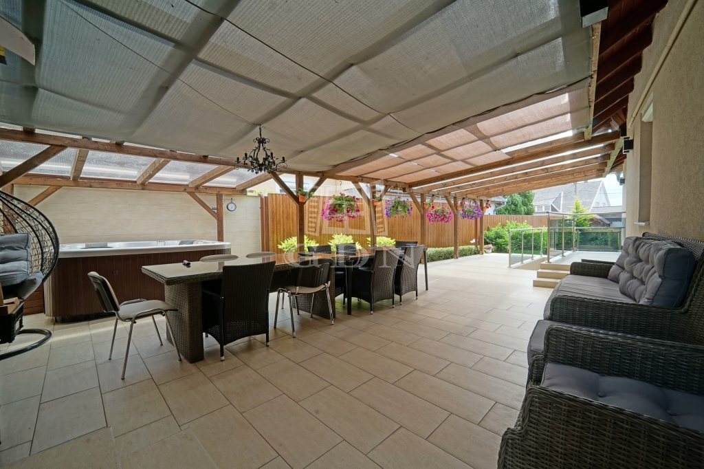 A parkosított kertet öntözőrendszer locsolja helyettünk. A megközelítőleg 70m2-es fedett terasz kiválló helyszíne a családi összejöveteleknek és a pihenésnek. Az itt található jacuzzi is a vételár részét képezi.