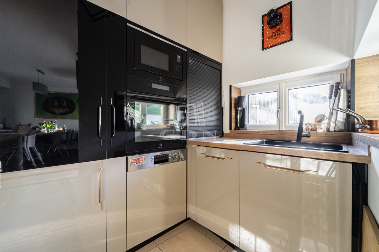 A bruttó 246 m²-es ház 175 m² nettó lakóteret kínál, valamint egy tágas, 50 m²-es garázst, ami akár több jármű számára is ideális. Az otthon szíve a világos nappali-étkező, amely közvetlen kapcsolatban áll a napfényes első és hátsó teraszokkal. A modern, gépesített konyha, a vízteres kandalló és a minőségi burkolatok meleg, otthonos hangulatot árasztanak.