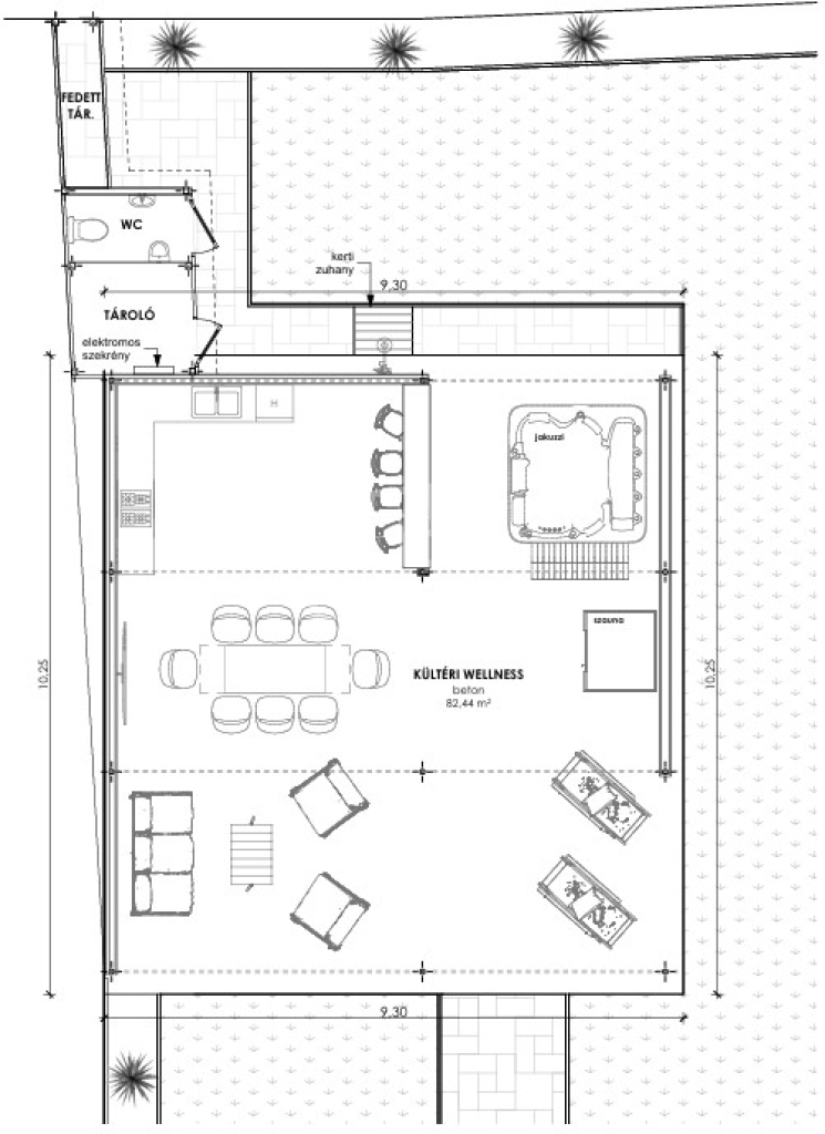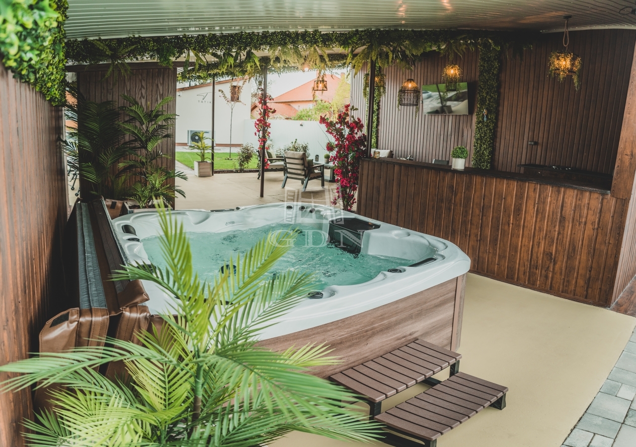 Kiegészítő szolgáltatás a wellness szekció: A kertben telepített infraszauna és jakuzzi biztosítja a magasabb kategóriájú árazás lehetőségét.