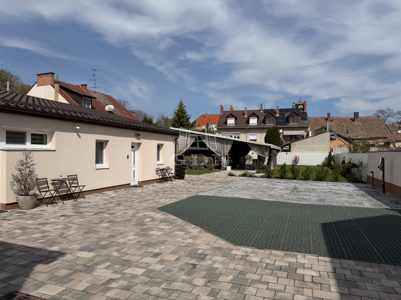 A parkolás 5 db udvari parkolóhelyen megoldott, és 2 darab elektromosautó-töltő is telepítésre került.