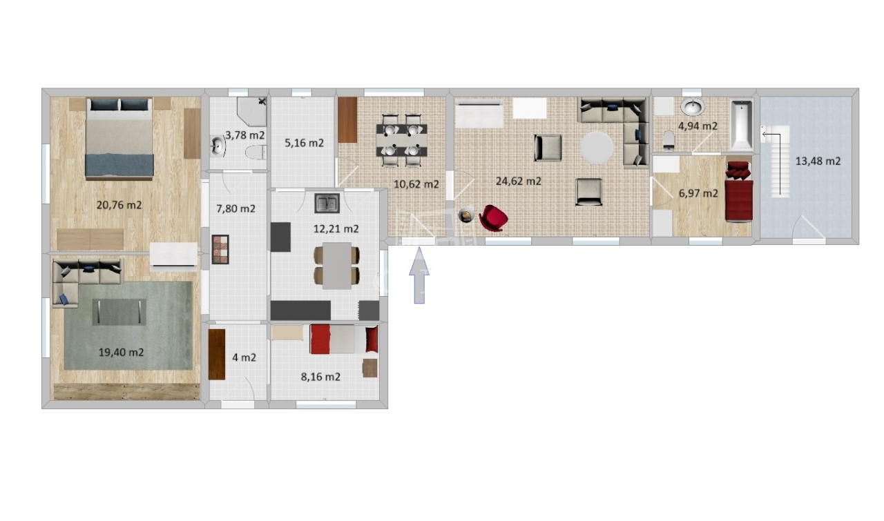 A ház téglából épült, és tágas, jól tagolt terekkel rendelkezik: három hálószoba, egy félszoba, valamint különálló nappali, konyha, étkező biztosít kényelmes életteret. A két fürdőszoba és a kamra további praktikusságot ad a mindennapokhoz.