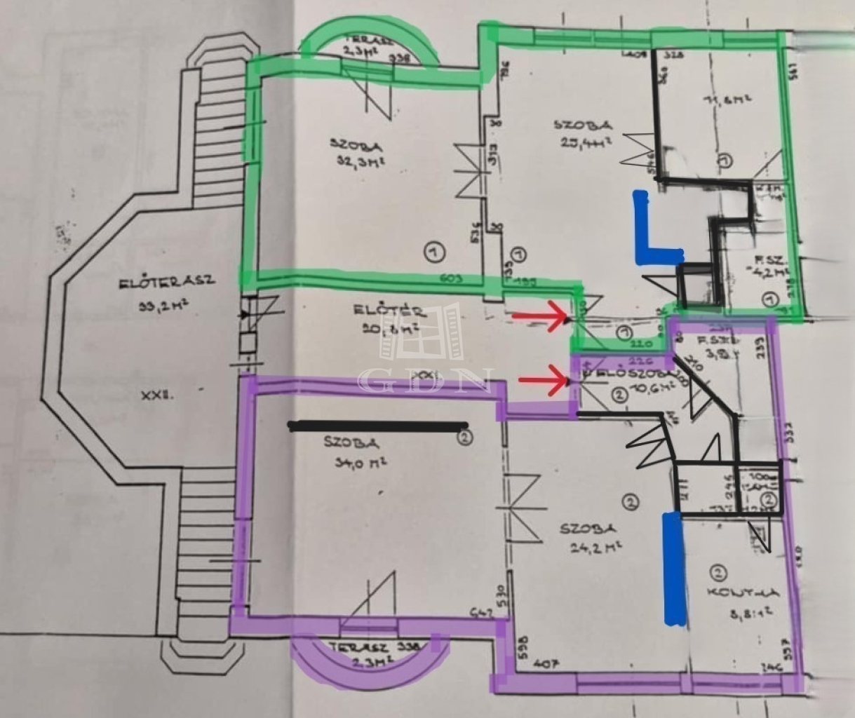 Az 1918- ban épült villa historizáló - eklektikus stílusban épült, az építész annak idején a házat saját magának tervezte, napjainkban folyamatosan karbantartott, állapot megőrzése, illetve javítása érdekében a társasház folyamatosan törődik vele, pályázatokon indul! Eladó ingatlanunk a magasföldszinti szinten helyezkedik el, (alaprajzon a lilával körbejelölt) egyik különlegessége, hogy a házba egy tekintélyes 33 nm-es külső teraszról jutunk be, majd a lakást egy zárt lépcsőházból közelíthetjük meg, ami a szomszéd ingatlannal kizárólagos használatban van.
