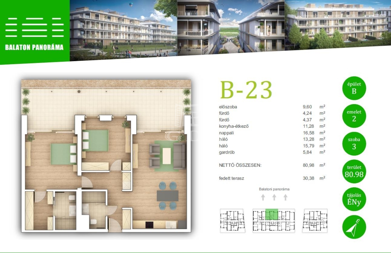 Ez a lakás nappali+2 hálós+ gardrób szobás, 81nm alapterületű+ tartozik hozzá 30nm fedett terasz is.