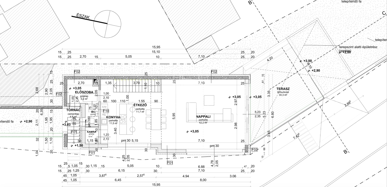 - Tető: 42°-os nyeregtető, Terrán Zenit gránit cserépfedéssel