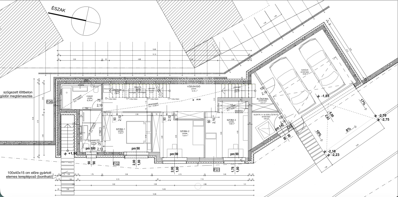- Falazatok: Porotherm 30 N+F kerámia rendszer + méretezett vasbeton falak