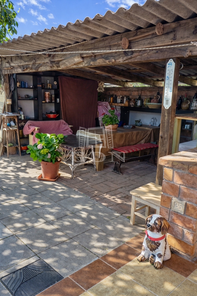 A házhoz kapcsolódik egy hangulatos, rusztikus stílusú, fedett terasz, amely egyedi elképzelések alapján, gondos kivitelezéssel készült.