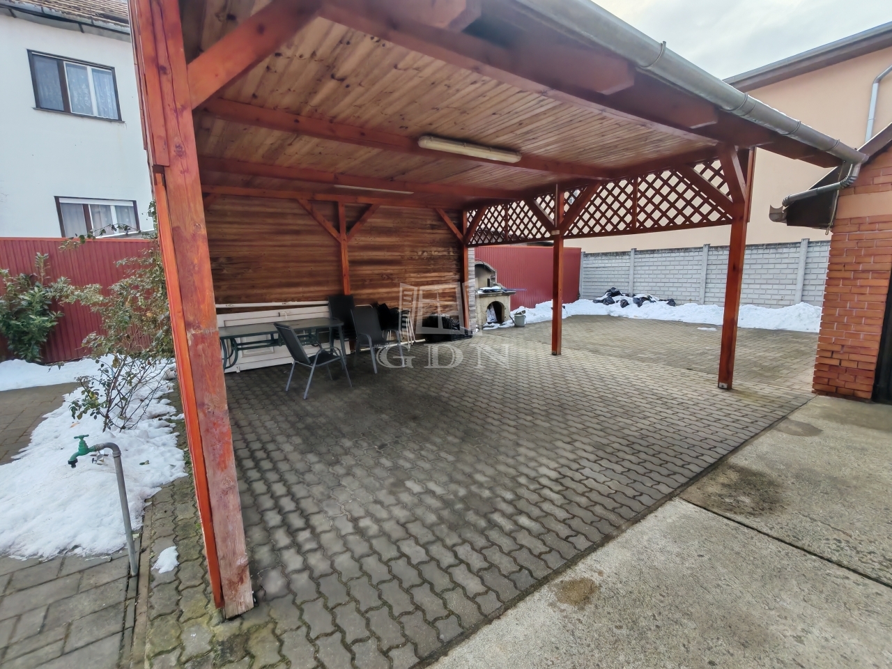 Garázs:25nm, szerelőaknás, pince lejárattal + 3 db tároló helyiség, kerti fedett kiülő ,fából, tetővel ellátva.