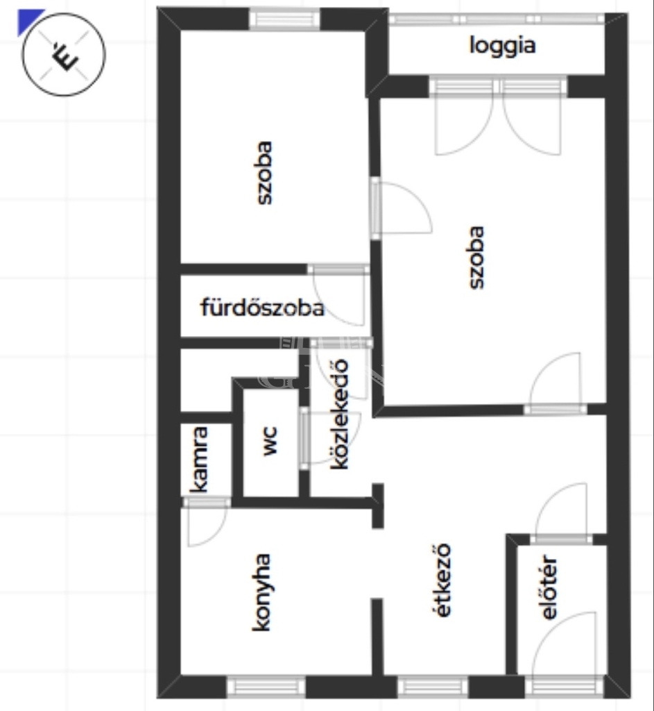 A lakás praktikus elosztású: az előszobából egy tágas hall nyílik, ahonnan külön megközelíthető a konyha és a nappali. A hallból egy kisebb közlekedő vezet a kádas fürdőszobához és a külön helyiségben kialakított WC-hez. A nappaliból egy kisebb szoba nyílik, amelyből a fürdőszoba is elérhető. A hallban beépített gardrób biztosít kényelmes tárolási lehetőséget, míg a konyhából egy praktikus kamra nyílik.