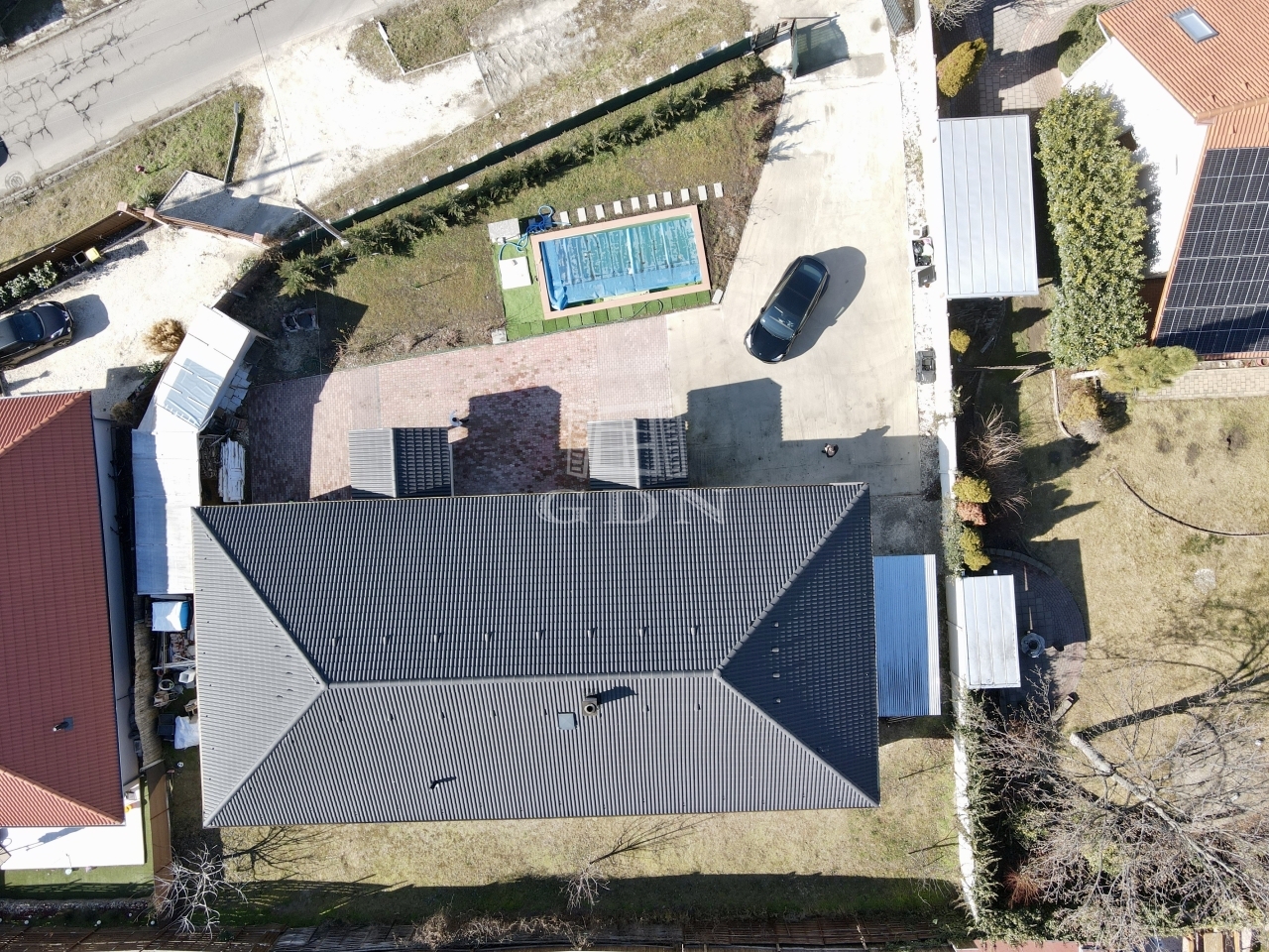 Az udvaron zsalukőből készült fóliás medencét találunk, hőszivattyús fűtéssel.
