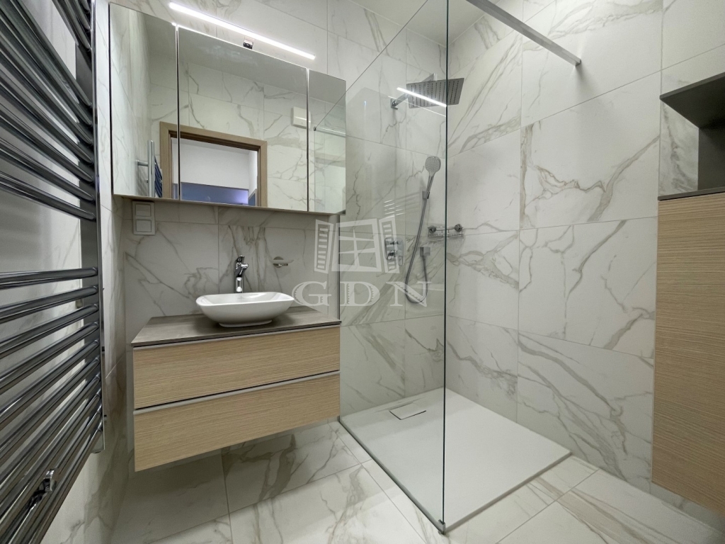 BL-003375. Belvárosban, modern akadálymentes, 2 lifttel ellátott társasházban 50 nm nagyságú, 6 nm-es erkéllyel rendelkező, amerikai konyhás nappali + 2 fél szoba elosztású lakás gépesítve, részben vagy egészben bútorozva (igény szerint), (jelenleg a képeken látható berendezési tárgyak találhatók meg), SMART HOME rendszerrel szerelve, valamint az épület alatt található teremgarázsban 1 autó számára biztosított beálló hellyel együtt hosszútávra kiadó.
