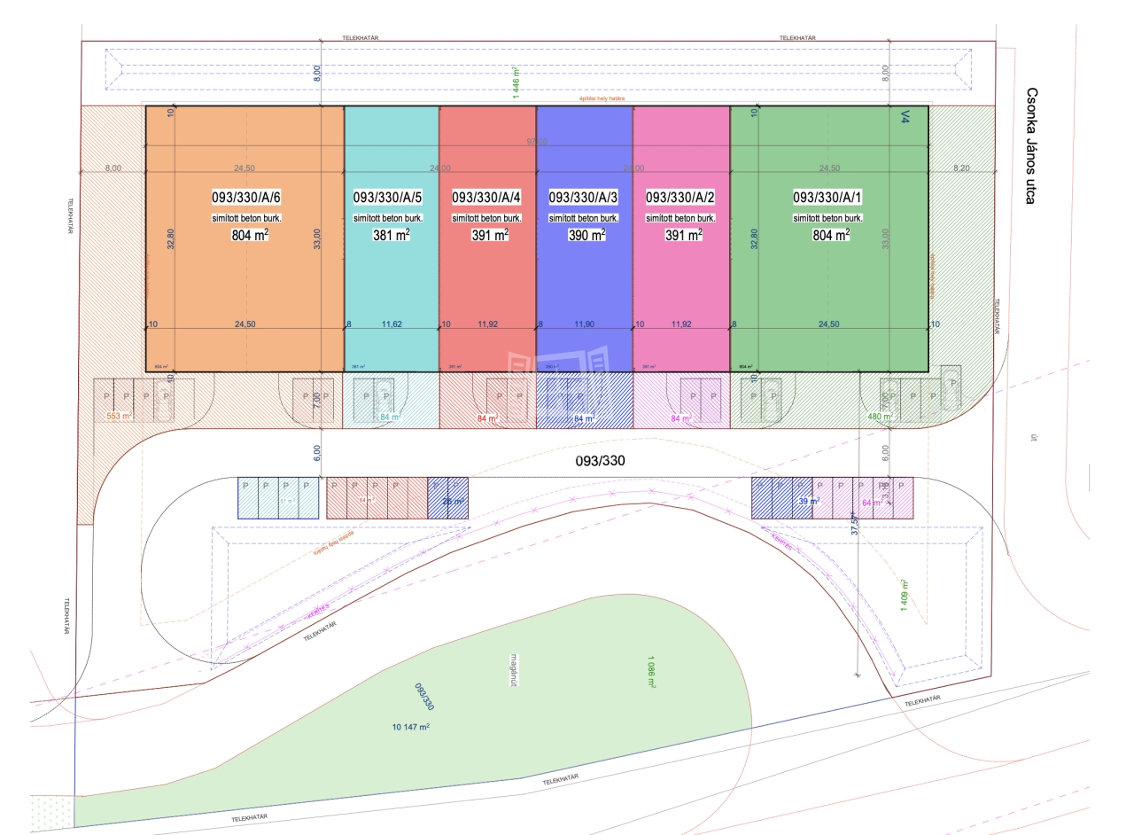 A csarnokokhoz tartozik a csarnok előtt lévő terület, illetve minden csarnokhoz jár plusz parkolóhely is.