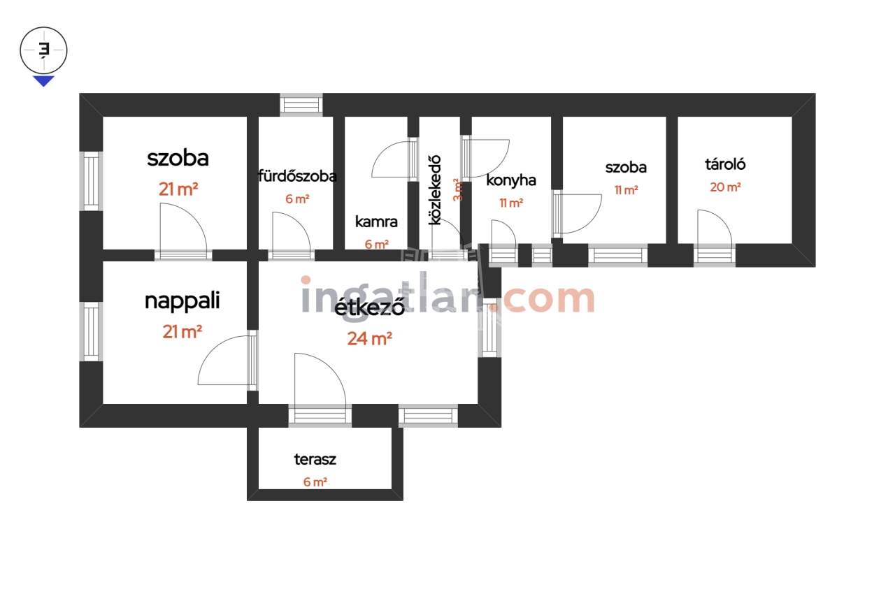 Helyiségek: fedett terasz, étkező-konyha, nappali, hálószoba, fürdő+WC, spejz kombinálva mosókonyha résszel, közlekedő, vendégkonyha, vendégszoba.