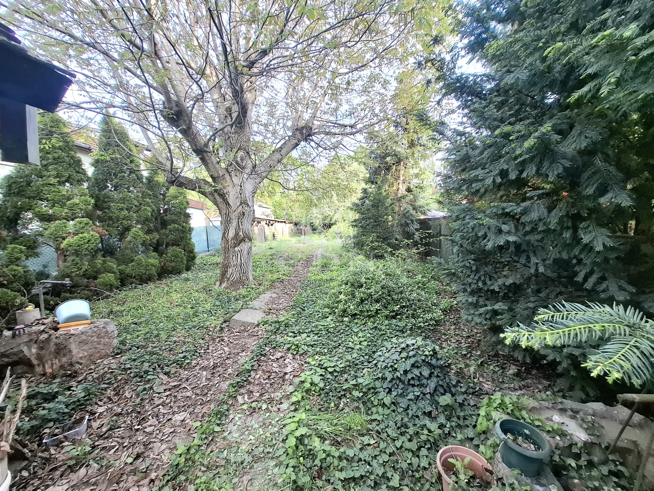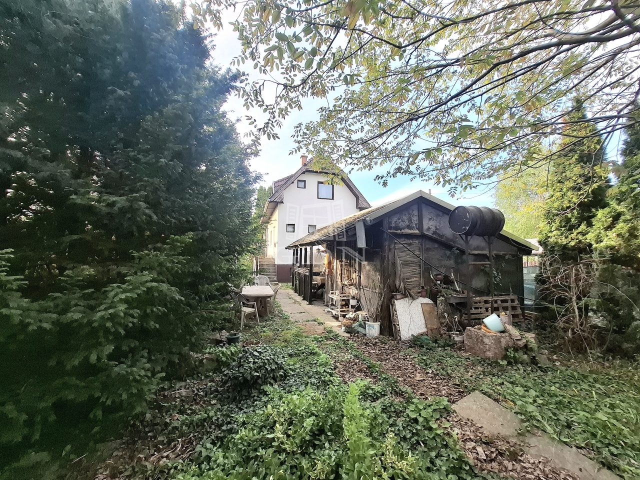 A 858 m²-es telek két utcára nyílik, ami további lehetőségeket rejt magában. A kert hangulatos,vadregényes jellegű, ahol helyet kapott: