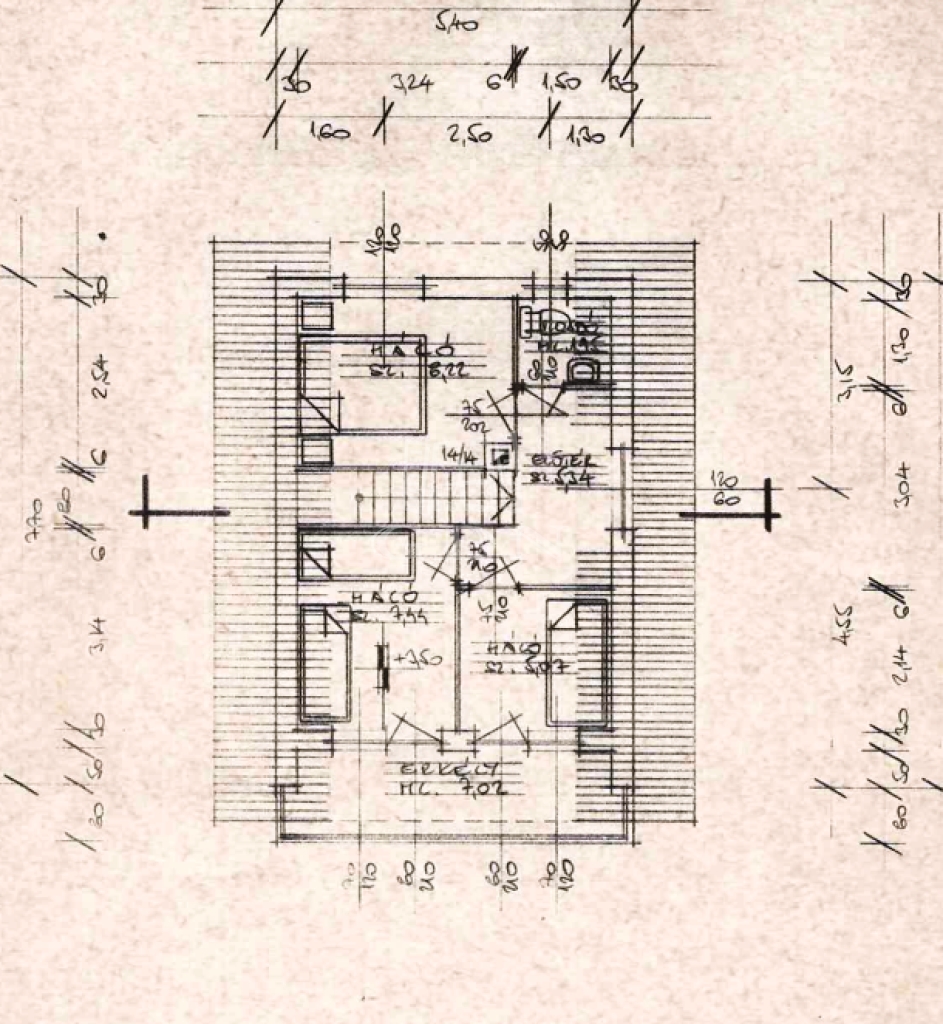 Tetőtér: közlekedő 5,35 nm, 3 hálószoba egyenként 5,35 nm, 5,98 nm, 4,98 nm, erkély 7,02 nm.