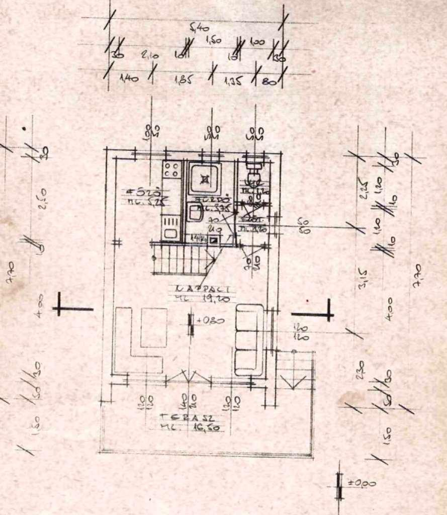 Középső szint: nappali/ étkező terasz kapcsolattal 19,92 nm, konyha 4,20nm, fürdőszoba 3,00 nm, wc 1,220 nm, előtér 1,20 nm, terasz 16,50nm.