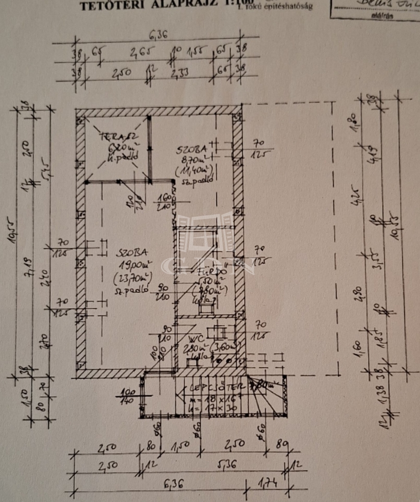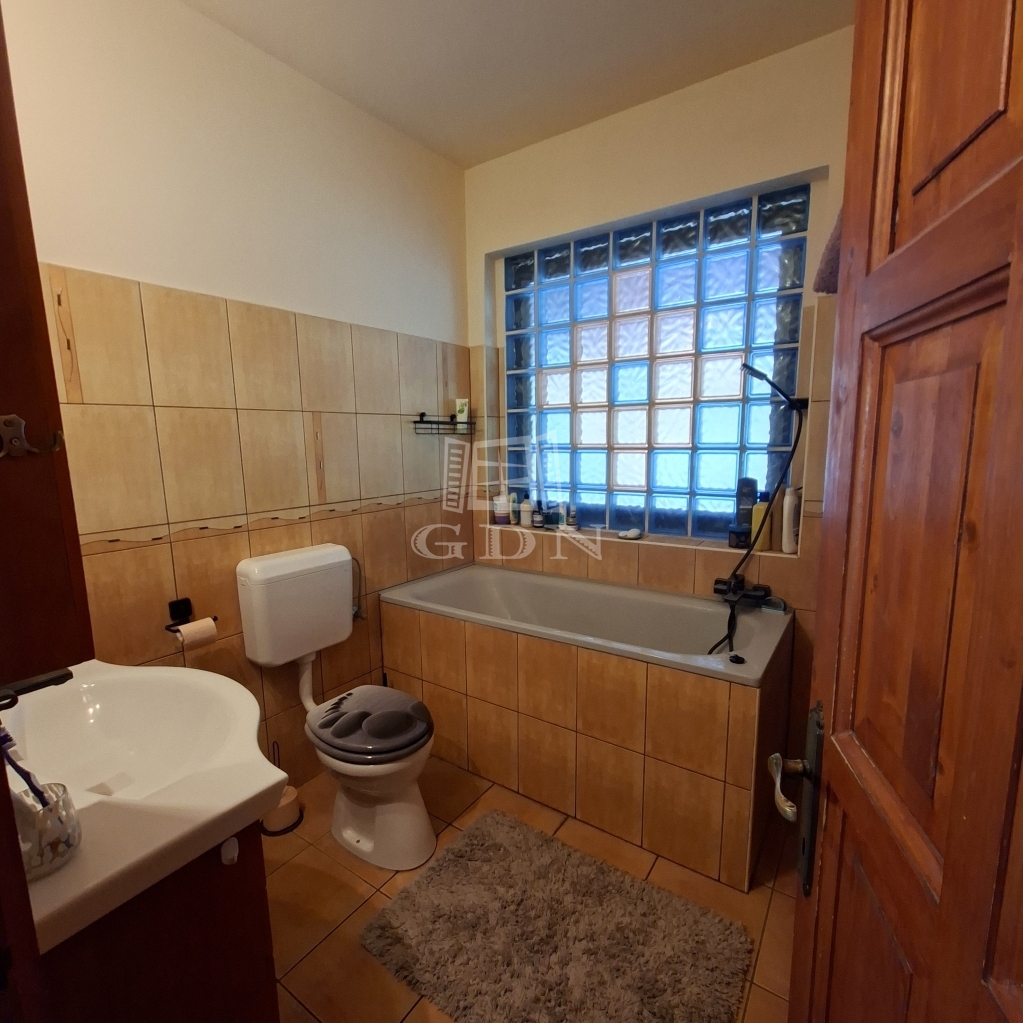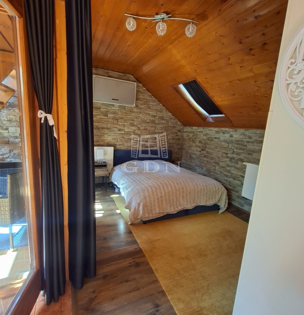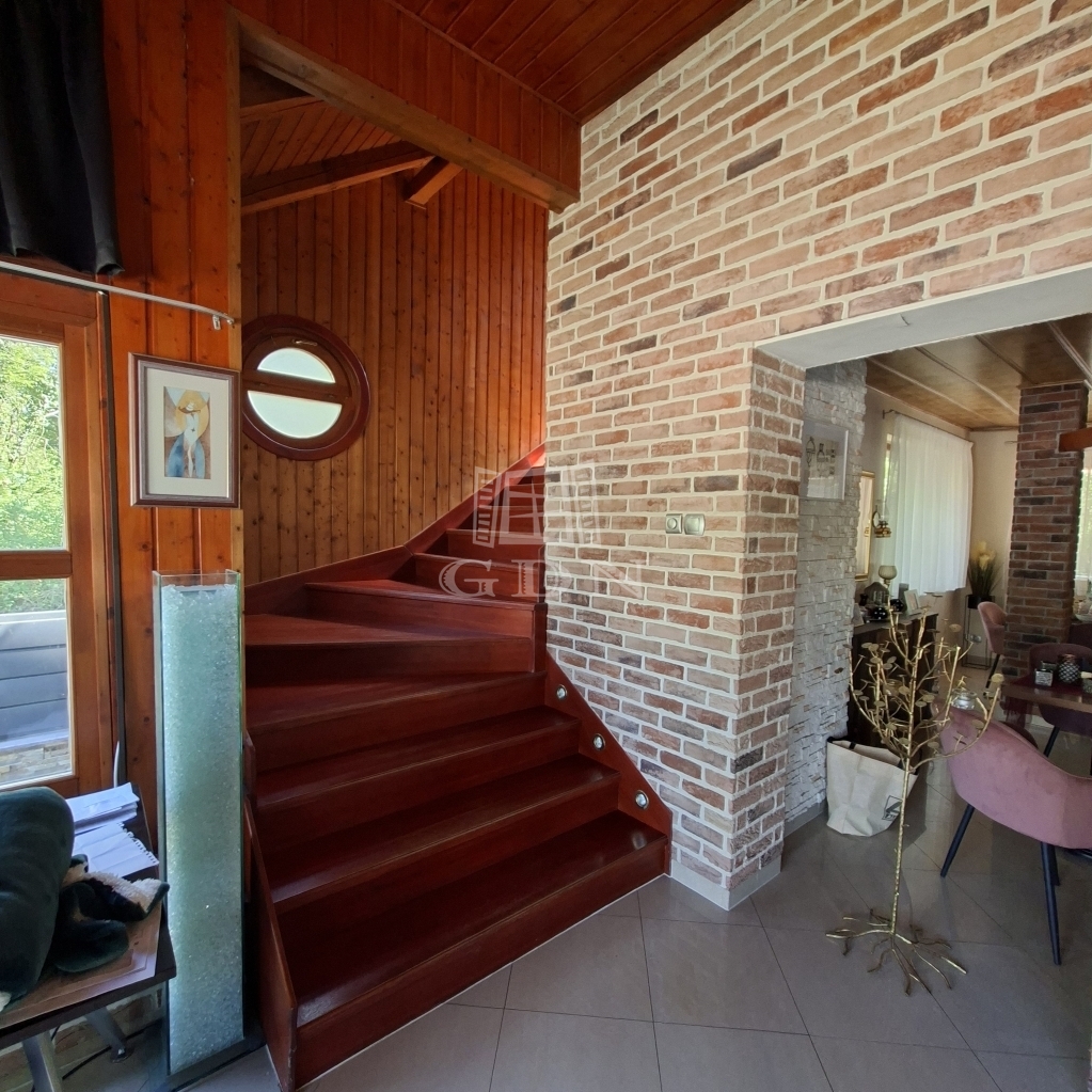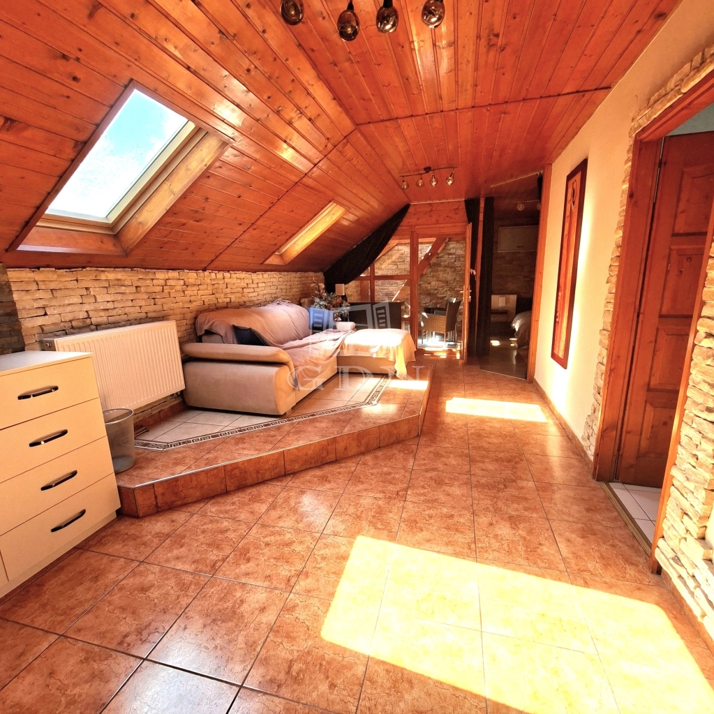 És maga az épület....., a földszinten, ami 84 m2 egy tágas nappali, aminek az udvar felé teljesen üvegezett az oldala, egy nagy étkező, konyha, fürdő és egy tároló található (amit a jelenlegi tulajdonosok vendégszobaként hasznosítanak), a bejárat felől pedig egy fa szerkezetű teraszt alakítottak ki. A tetőtérben, aminek hasznos alapterülete 36 m2, található egy illemhelyiség, fürdő, hálószoba és egy nappali szoba, innen is egy fedett erkélyre jutunk.