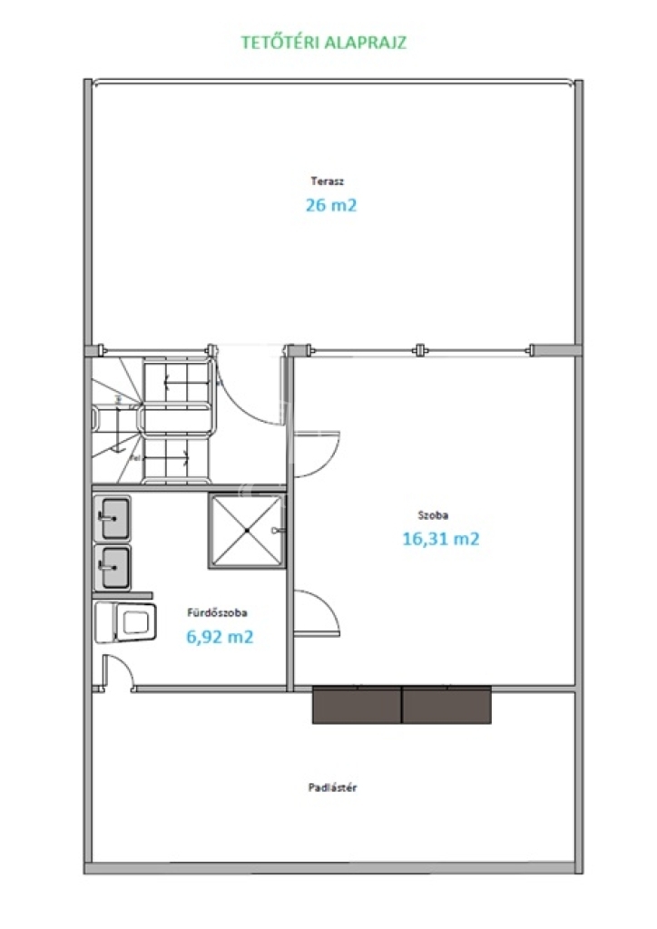 A lakás különlegessége fenti kis előtérből nyíló 26 m2-es, DNy-i tájolású, rendkívüli kilátást biztosító tetőterasz, amelyet tetőtér megnyitásával tudtak megvalósítani.