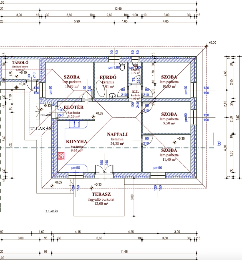 Külső falazat: Ytong 30 cm-es, 12 cm-es Dryvit hőszigeteléssel, 20 cm-es cellulóz alapú fújt födém szigeteléssel.