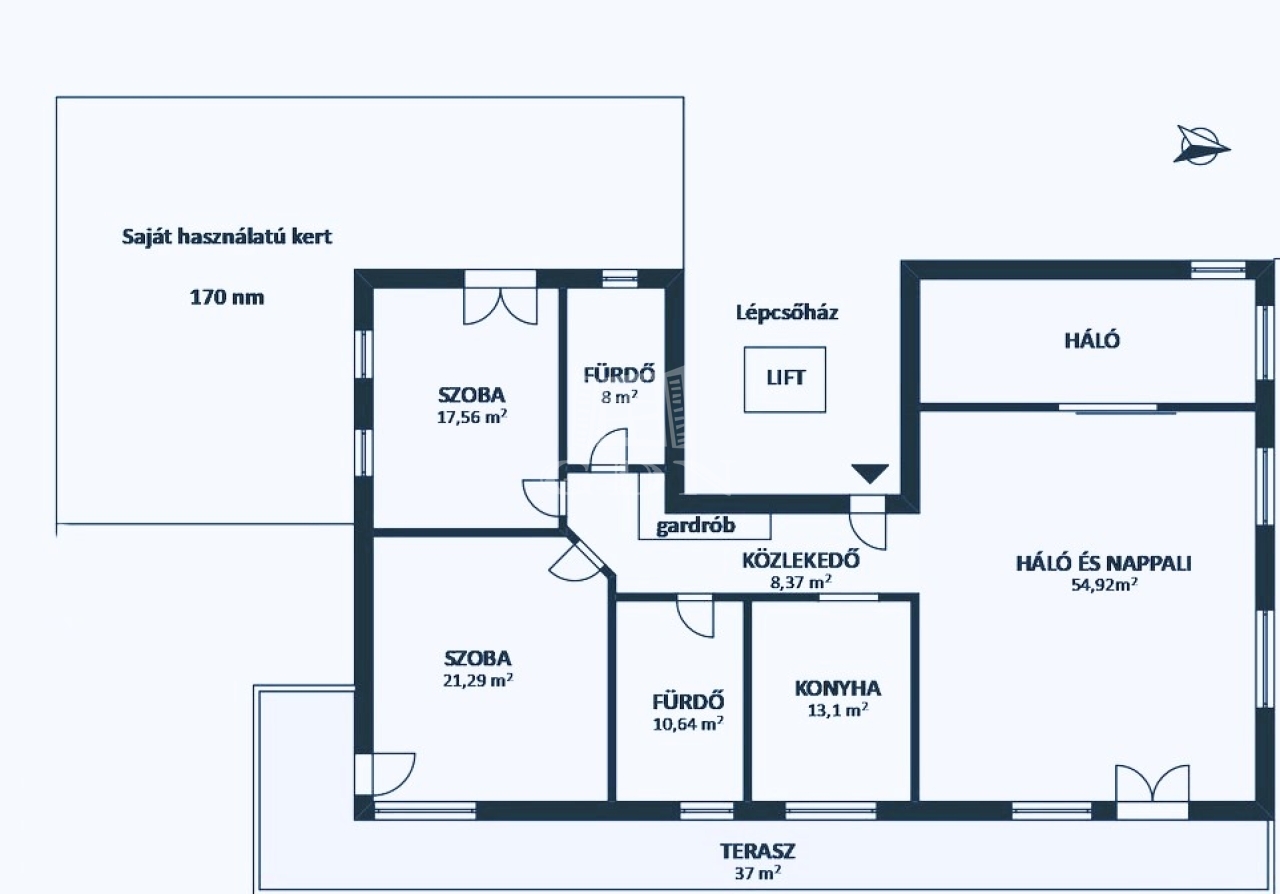 A 2005-ben épült, téglaépítésű, mindössze 5 lakásos társasház nyugodt, exkluzív lakókörnyezetet biztosít. Az épületet gondozott kert veszi körül, a lakók közös használatára. A lakás elrendezése kiváló: tágas nappali, három külön nyíló hálószoba, két fürdőszoba és egy kényelmes méretű konyha található benne. A nappali és az egyik hálószoba közvetlen kapcsolatban áll a nagyméretű terasszal, míg az egyik hálószobából közvetlen kijárat nyílik a saját kertbe, amely ideális pihenésre vagy baráti összejövetelekhez. A lakás világos, jól tájolt: az utcai oldal északkeleti, a kert felőli rész délkeleti fekvésű.