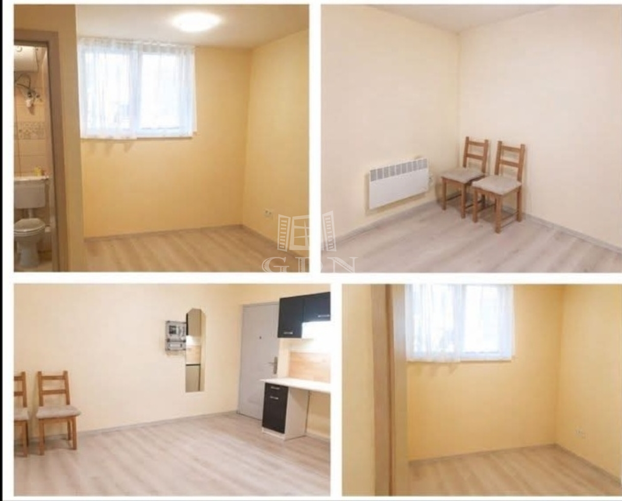 Egy légterű, világos burkolatokkal kialakított szoba, könnyen berendezhető, jó térkihasználással.