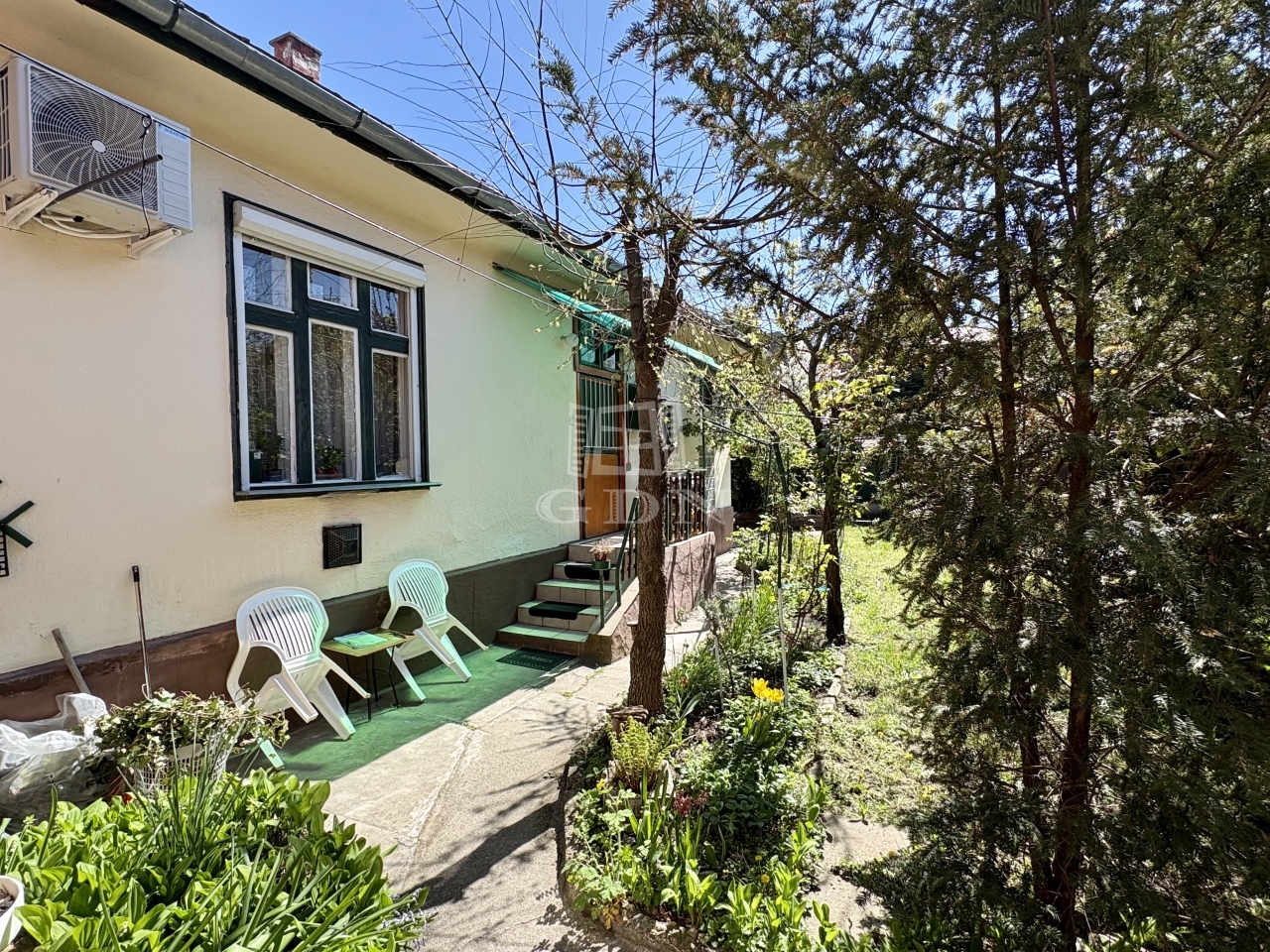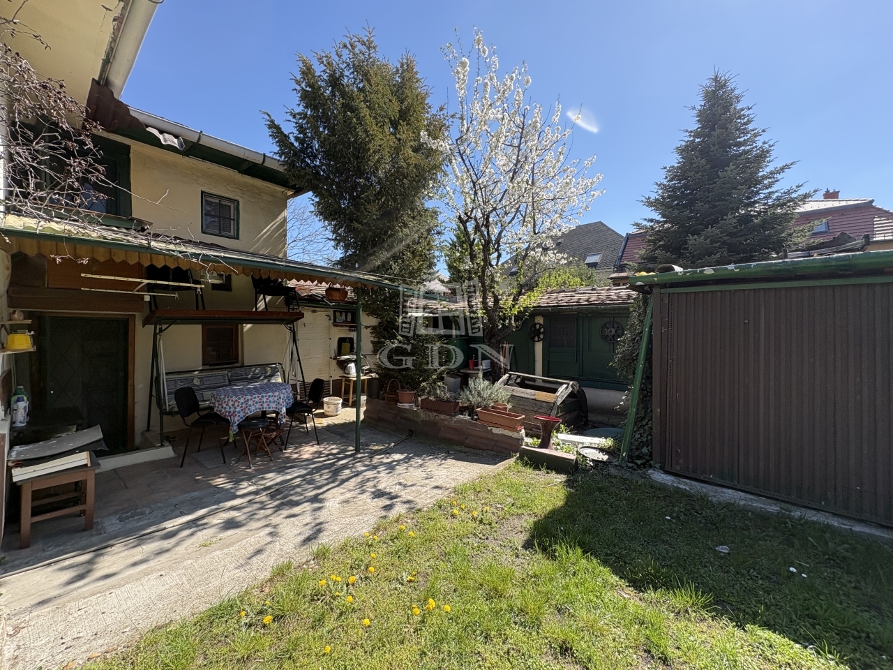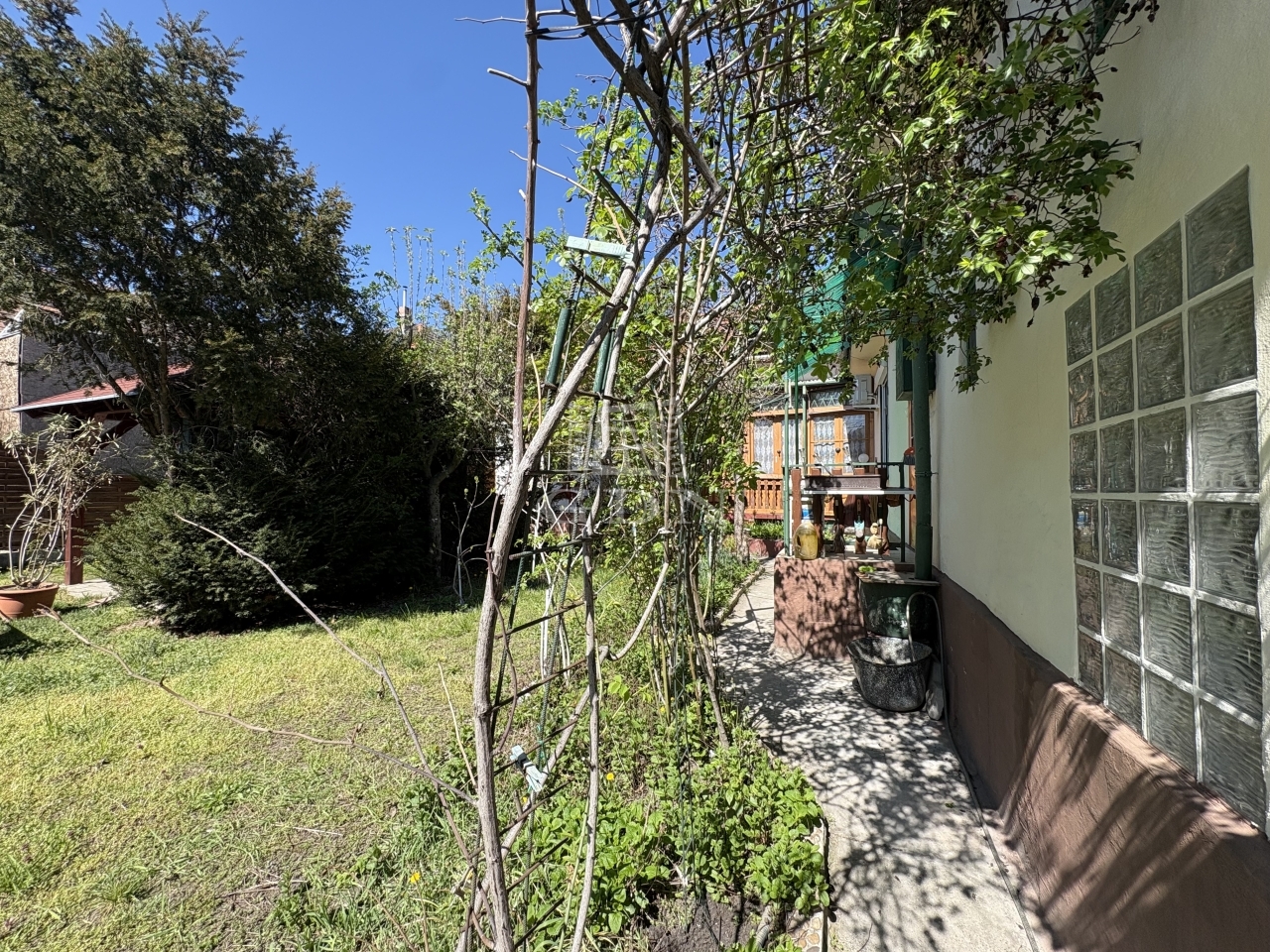 Tartozik hozzá pince, padlás, előkert, sziklakert és kocsibeálló.