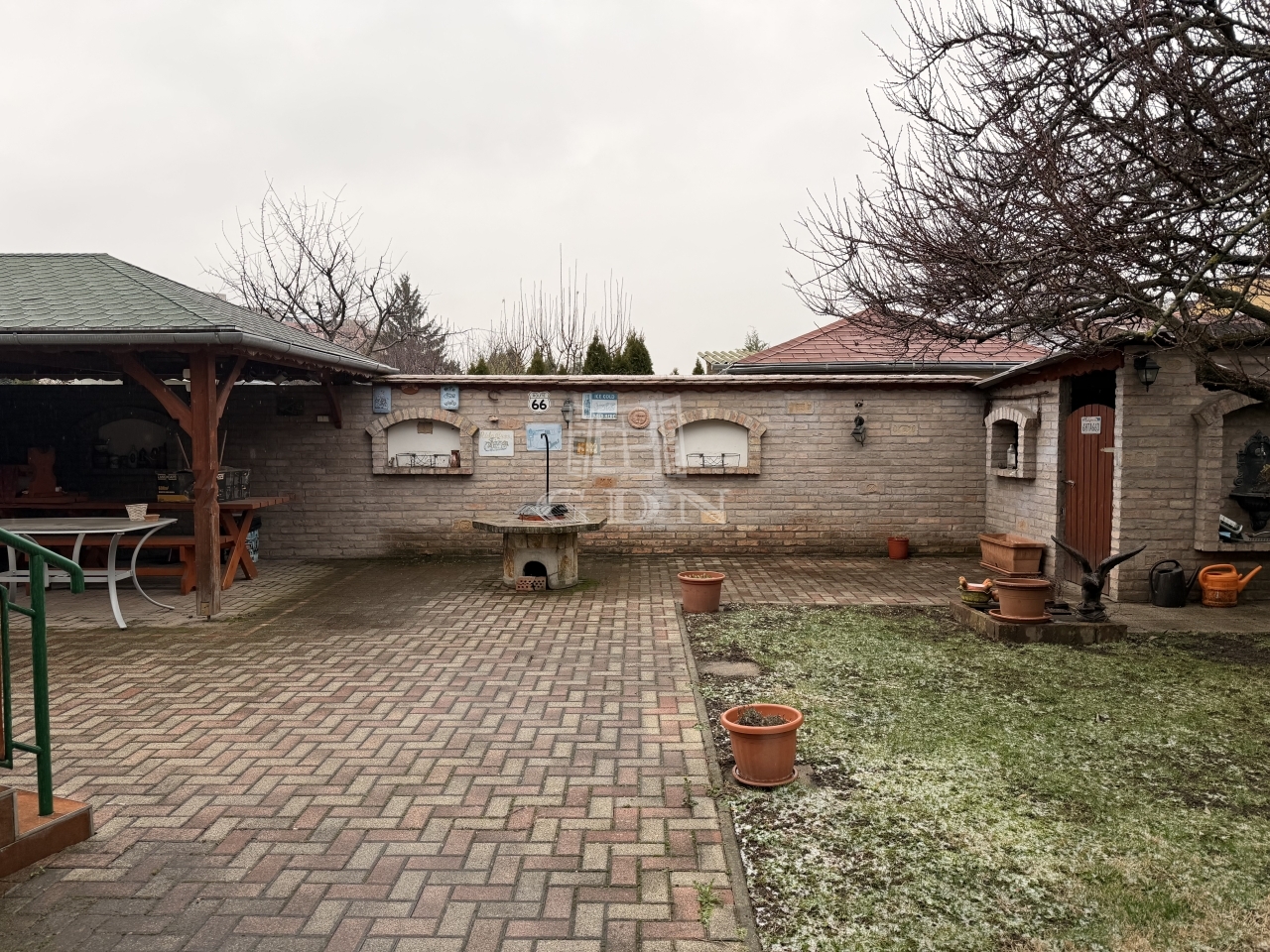 Az udvar parkosított, amiben 2db 35 éves diófa, és 1db 20 éves kajszi barack fa ad nyáron hűsítő árnyékot, és meghatározza a kert hangulatát.