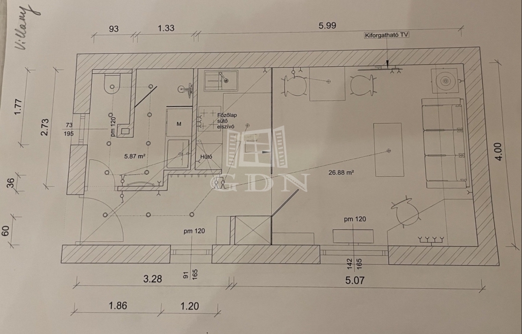 A lakás 33 nm-es, ami egy szobából, előszobából, konyha+étkezőből,