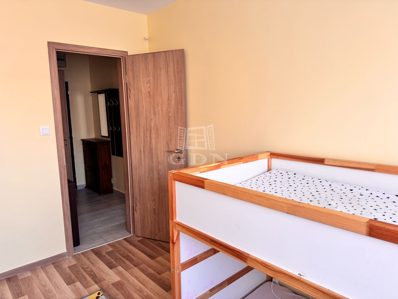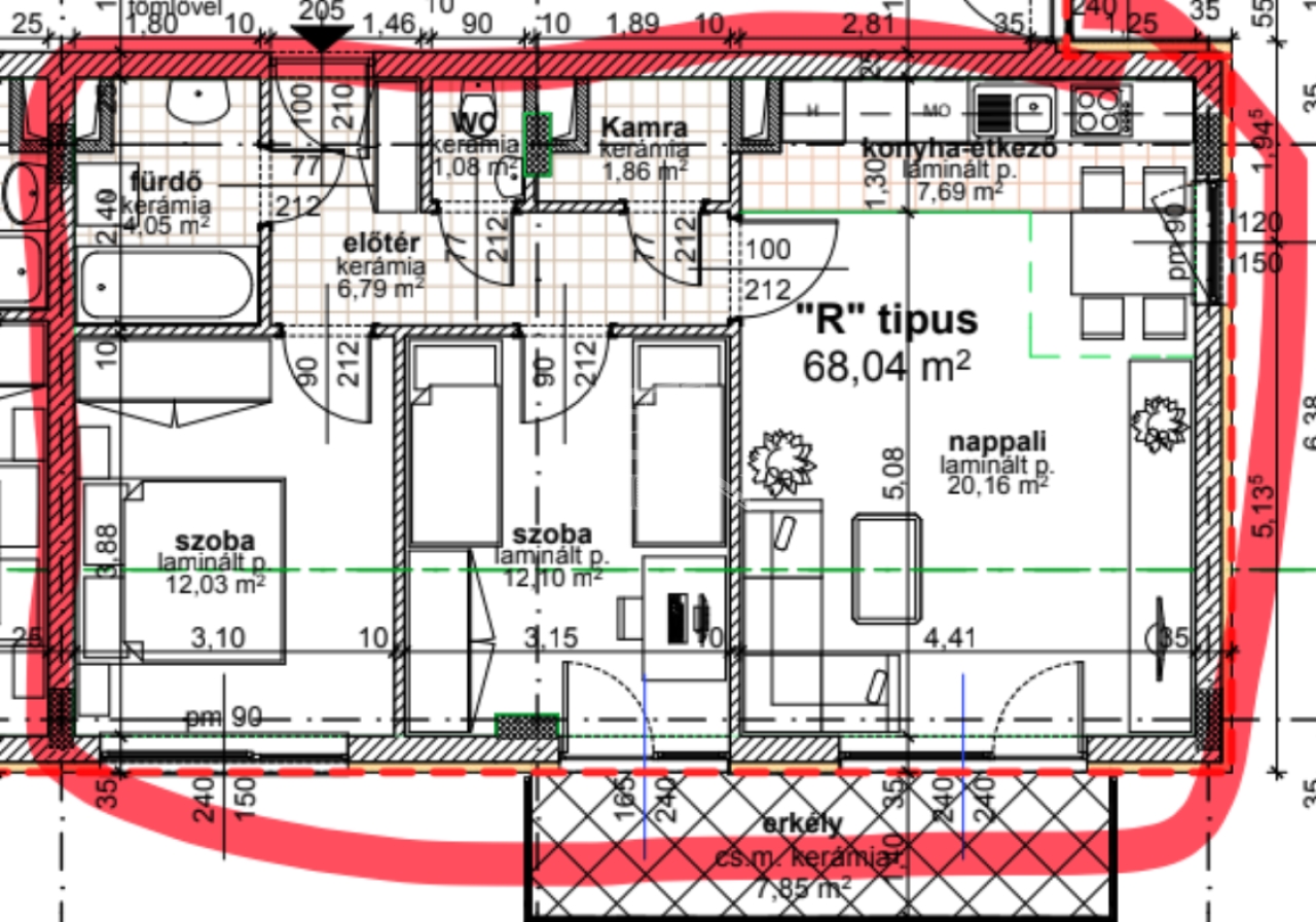 A szobák parkettával burkoltak, míg a konyha, fürdőszoba, WC és közlekedő egységes, esztétikus kőburkolatot kapott. A beépített konyhabútor a vételár részét képezi.
