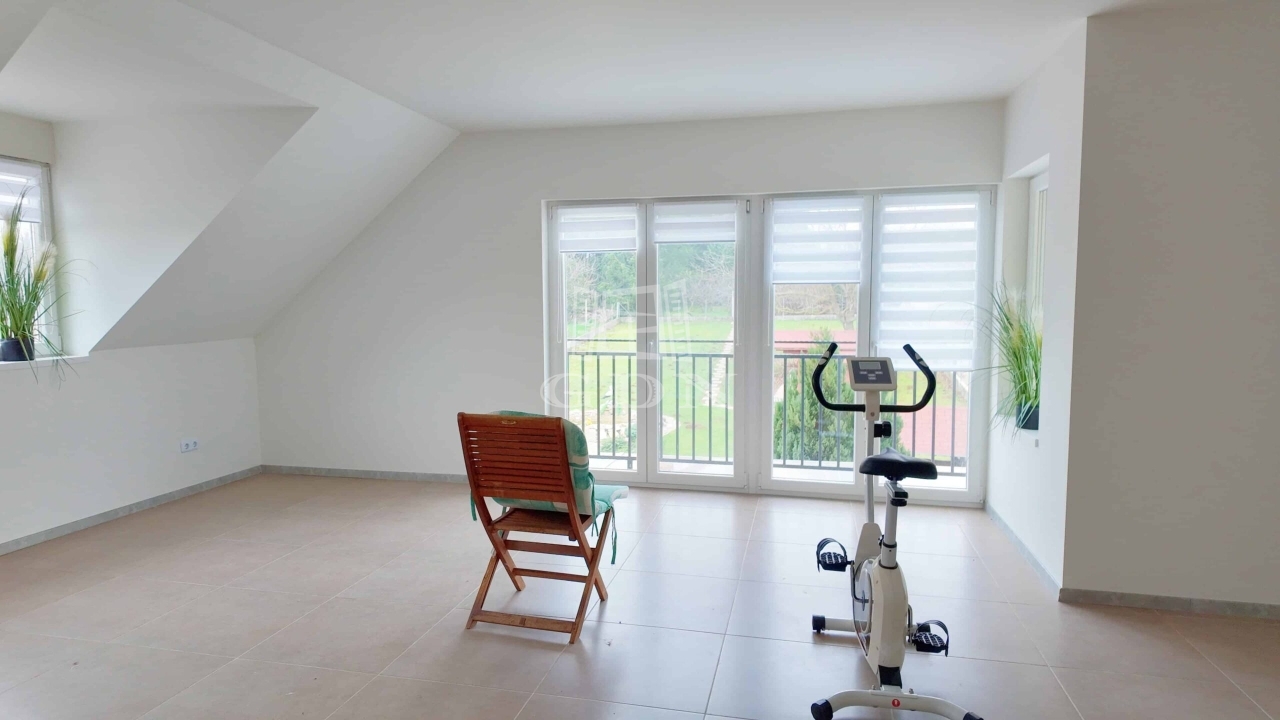 Az emeleten előtér, nappali, két hálószoba, erkély, konyha-étkező, két fürdőszoba, tárolóhelyiség és egy fitneszterem kapott helyet.