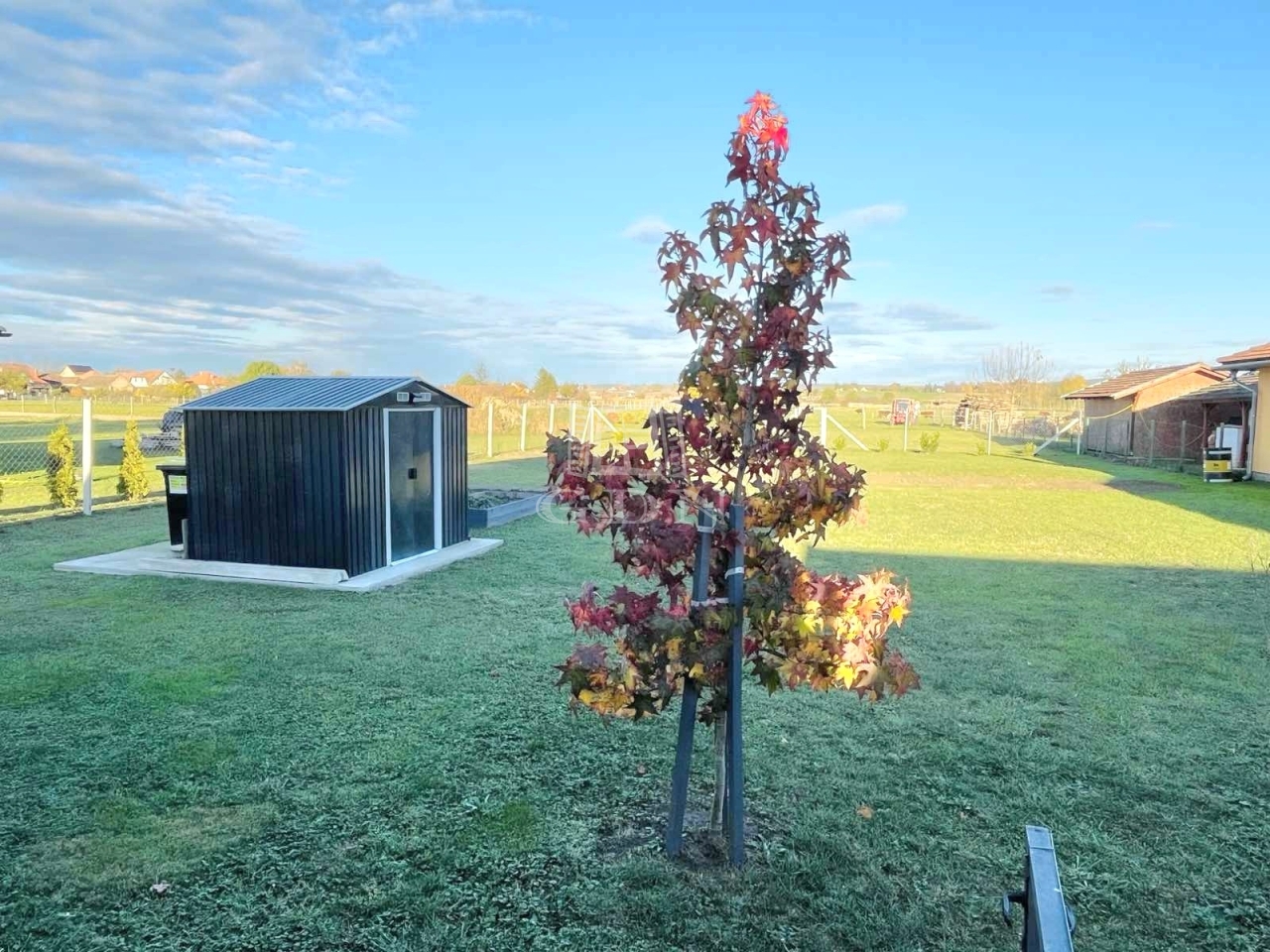 A teljesen sík, gondozott, bekerített telek biztonságos és kellemes környezetet biztosít, ahol a tágas terasz, a fedett kocsibeálló és az esztétikus tároló is a kényelmet szolgálja.