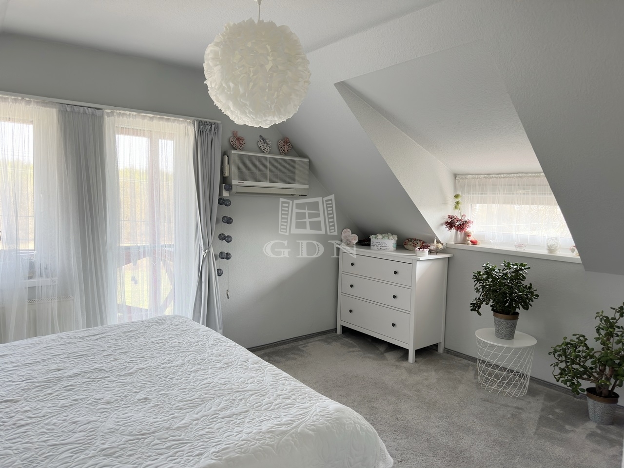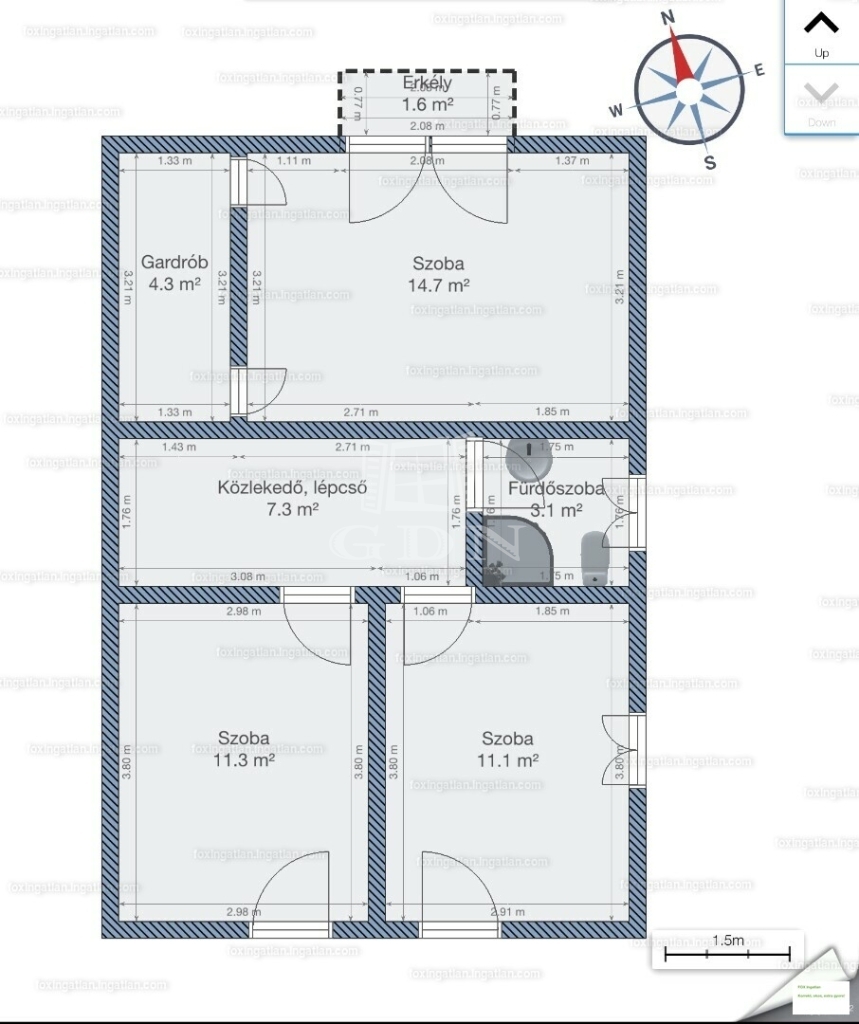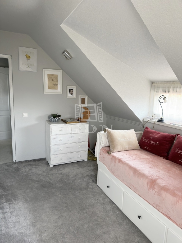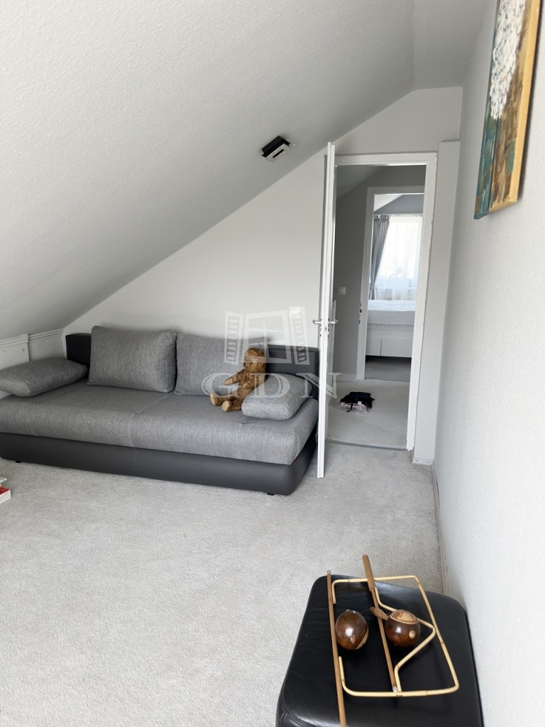 Az emeleti szinten két félszoba, egy fürdő w.c.-vel, valamint egy erkélyes hálószoba kapott helyet, kilátással a Gödöllői dombságra.
