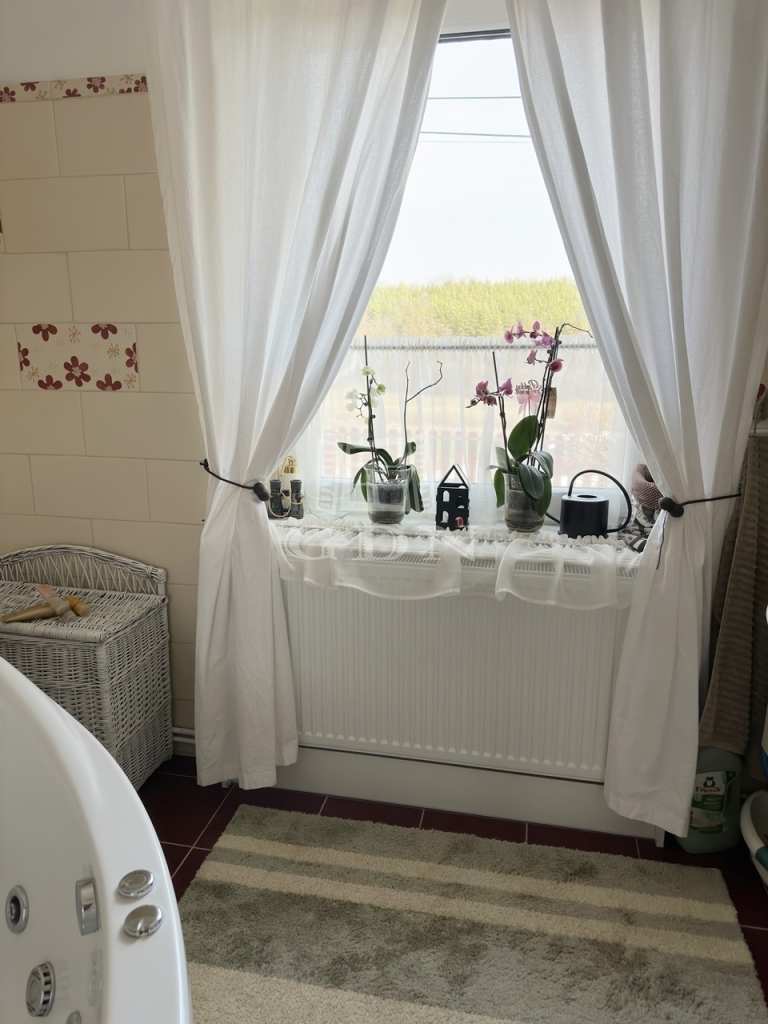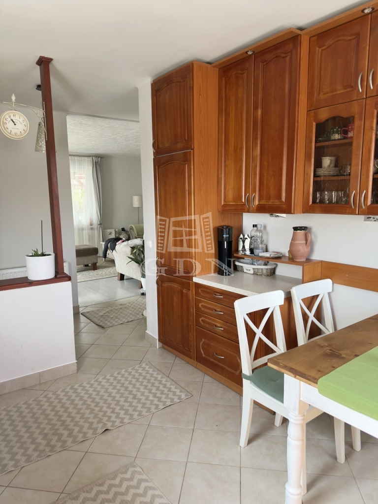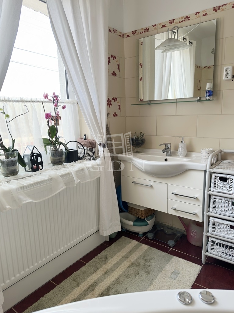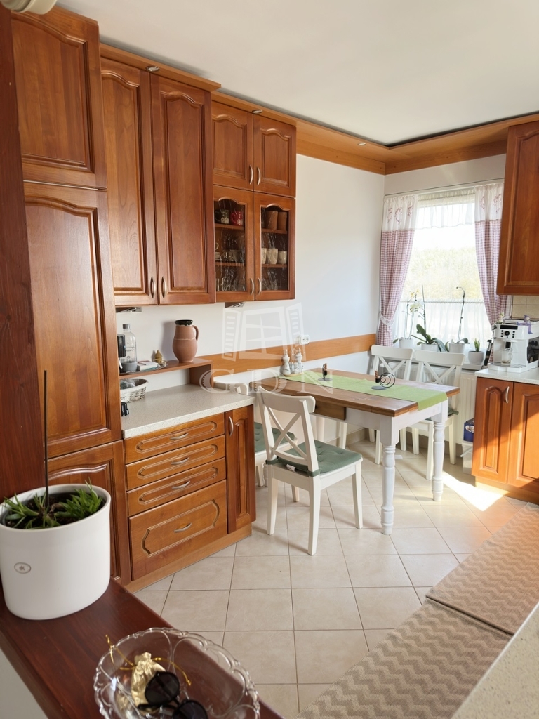 A nagyméretű műanyag ablakoknak köszönhetően az egész élettér világos és barátságos. A nappaliból egy fedett terasz biztosítja a kertkapcsolatot.