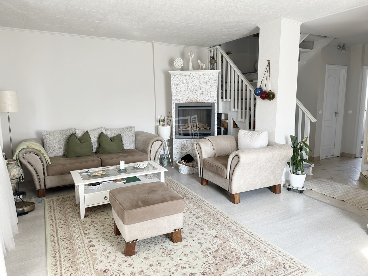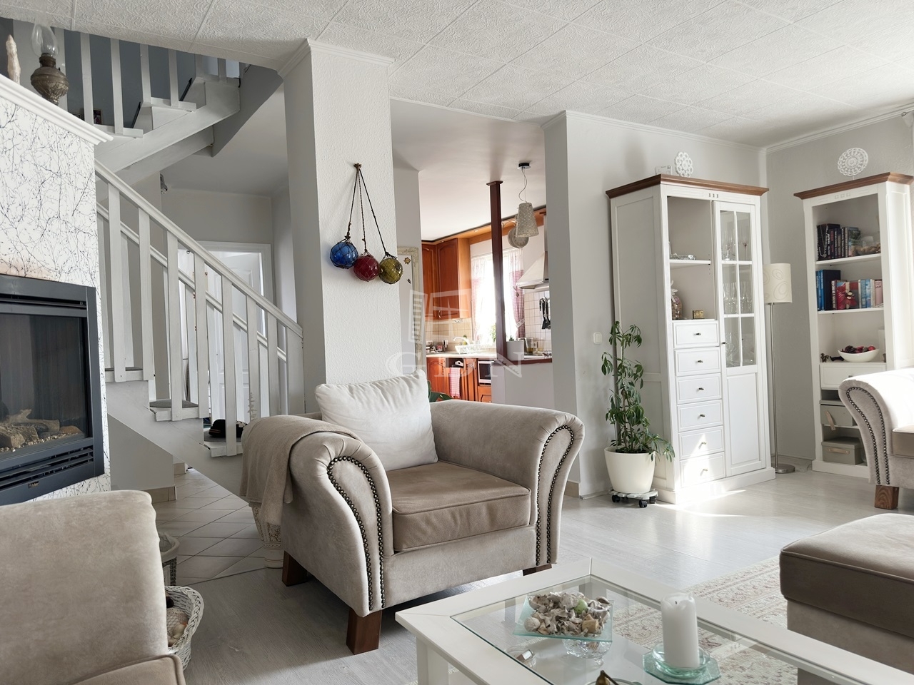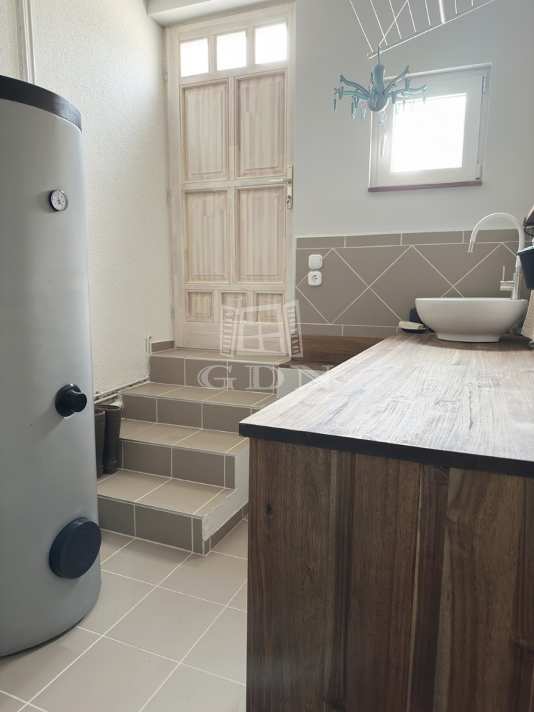 Az ingatlanba lépve az egy légtérben található közlekedő, konyha-étkező, nappali részre érkezünk. Innen nyílik egy sarokkádas fürdőszoba, egy mellékhelyiség, a lépcsőház az emeletre, illetve a házban lévő fűtött garázs felőli bejárat.