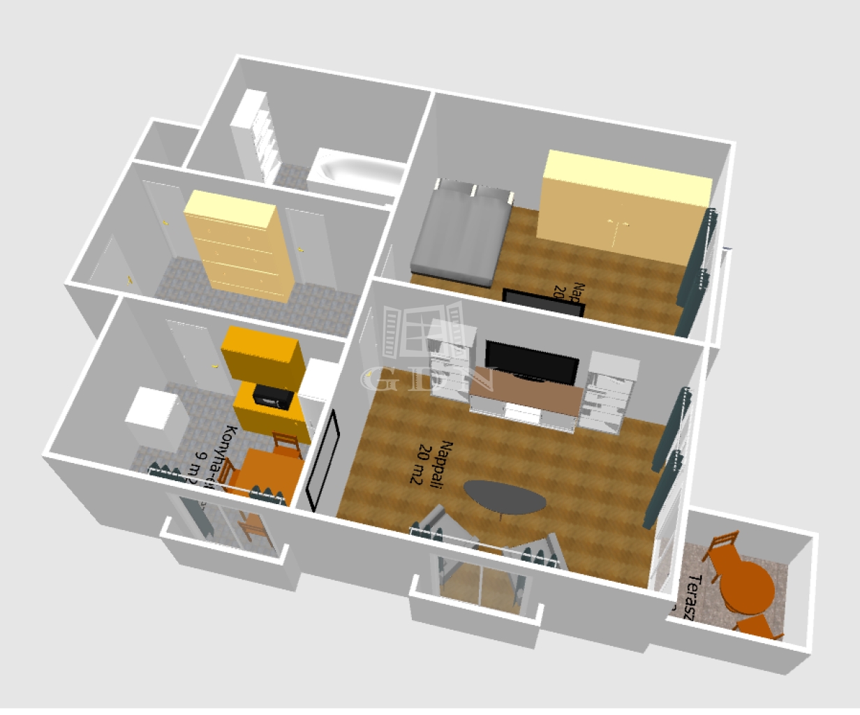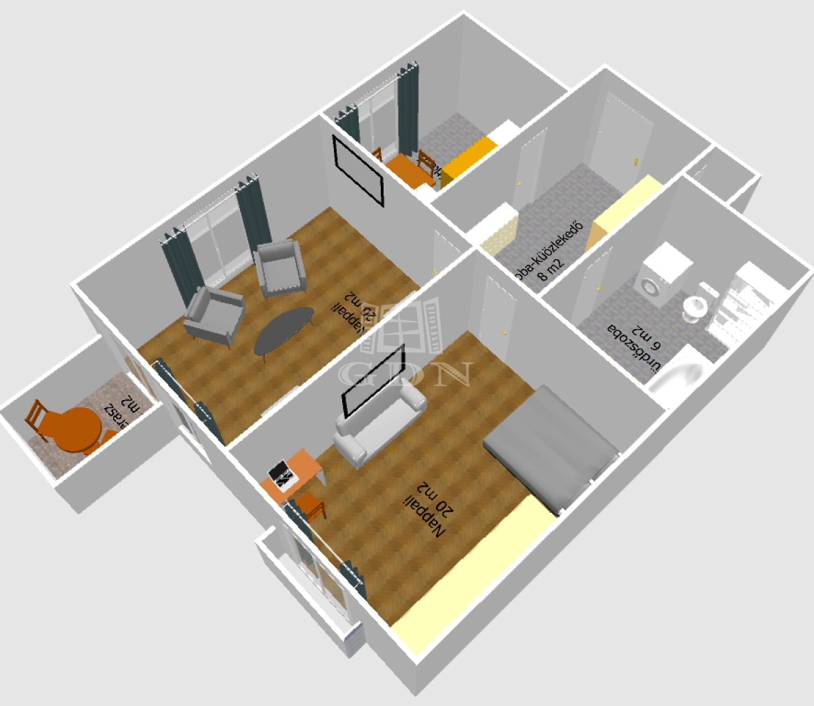 A 2 nagyméretű szobával rendelkező otthon optimális elosztása leginkább az élhető tágas terekben nyilvánul meg. A két külön álló francia, illetve egy normál méretű erkélyről egy belső parkra nyílik kilátás, ezért a nyüzsgő környék forgalmának zajától is teljes mértékben elszigetelt. A lakás felső emeleti elhelyezkedése lévén ragyogóan napos és világos.