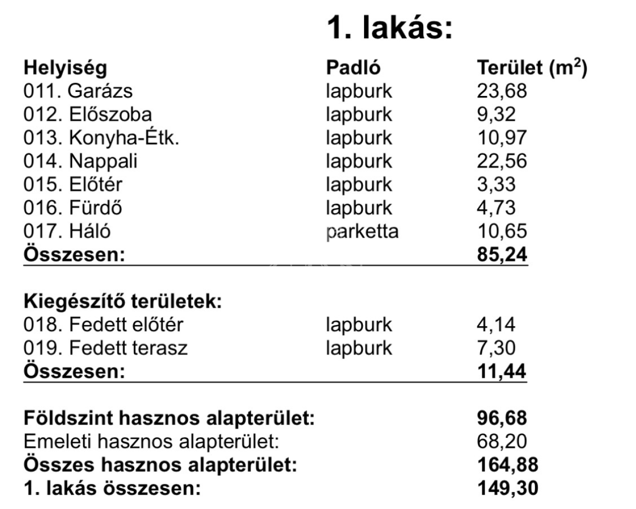 1. lakás: nettó 126 nm alapterület + 24 nm garázs + 19 nm terasz, 509 nm telekterület, 200.000.000 Ft